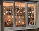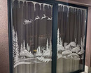 Впрочем, не стоит ограничиваться только оформлением стекла, ведь можно также украсить подоконник и шторы. На тюль можно подвесить легкие елочные игрушки, к портьерам прикрепить большие снежинки, а по карнизу пустить гирлянду. На подоконнике можно сделать зимнюю деревню с пушистыми сугробами и миловидными домиками, расставить электрические свечи (с обычными получится пожароопасно), разложить ветки нобилиса и т.д.