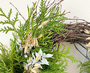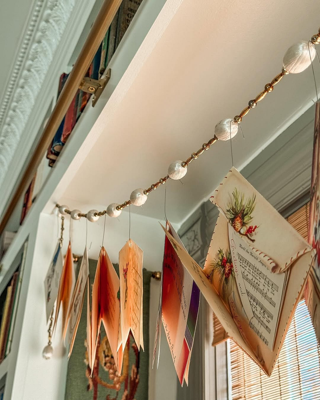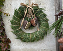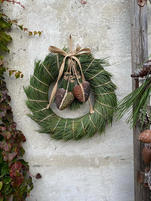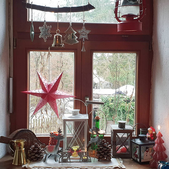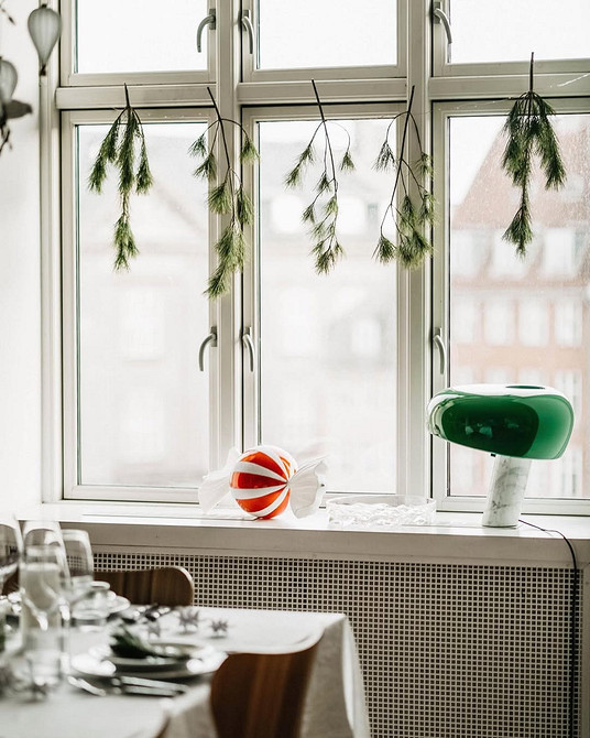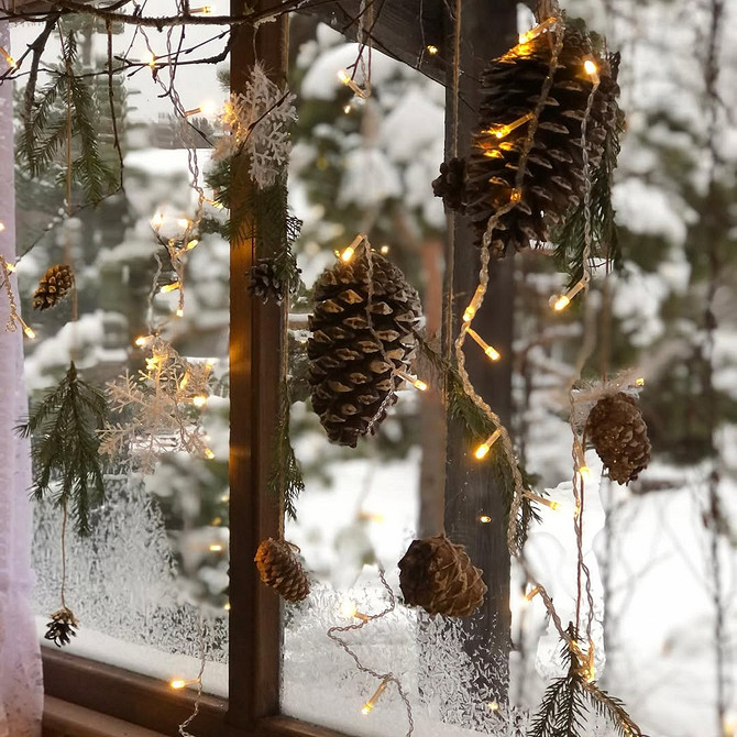 Экостиль предполагает использование природных материалов для создания декора. Подойдут всевозможные самодельные гирлянды и подвески с желудями и шишками, еловые лапки, игрушки из деревянных слэбов или сшитые своими руками, венки из нобилиса и т.д. Все это можно развесить на створках окон или разложить на подоконнике. При этом здесь, как и в предыдущем случае, важна умеренность — не стоит занимать декором все пространство, закрывая свет, идущий из окна.