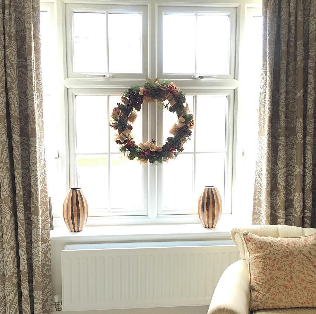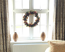 Если нет желания полностью украшать оконный проем или не хочется после праздников тратить время на то, чтобы отмыть рисунки и снять гирлянды и шары, повесьте венок из еловых лап, игрушек и мишуры. Можно сделать его своими руками или купить готовый. Просто зацепите его за оконную ручку или привяжите красивой лентой к карнизу — этого будет вполне достаточно для создания праздничной атмосферы.