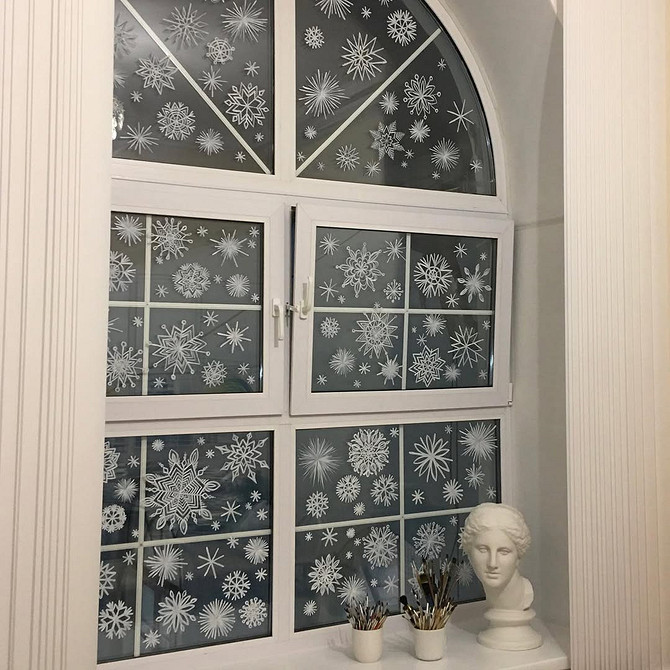 Наконец, самый простой вариант подготовить окна к Новому году — украсить их зимним орнаментом. Для этого надо купить наклейки или трафареты со снежинками, звездами и другой новогодней атрибутикой. Аккуратные повторяющиеся рисунки выглядят одинаково уместно и в детской малыша, и в изысканной гостиной, и на уютной кухне.