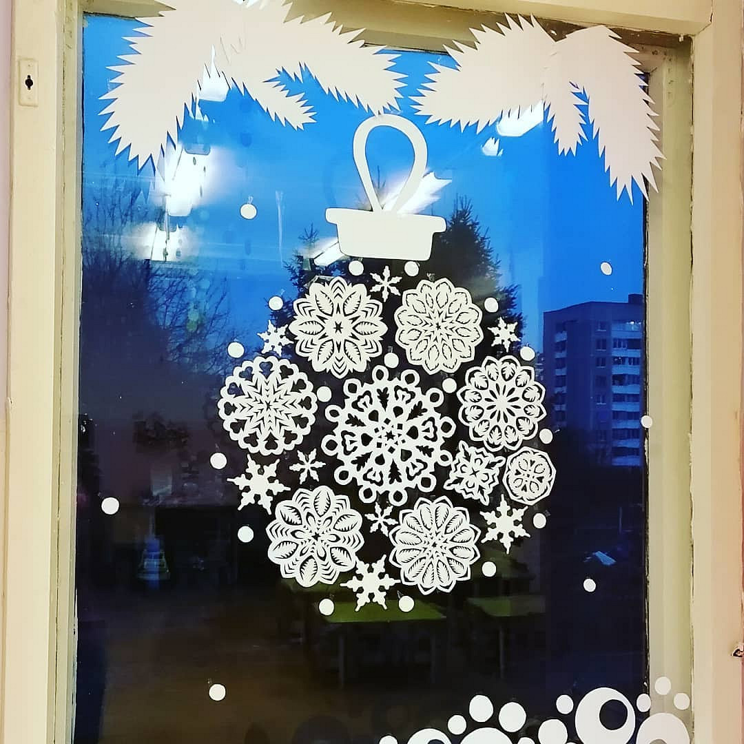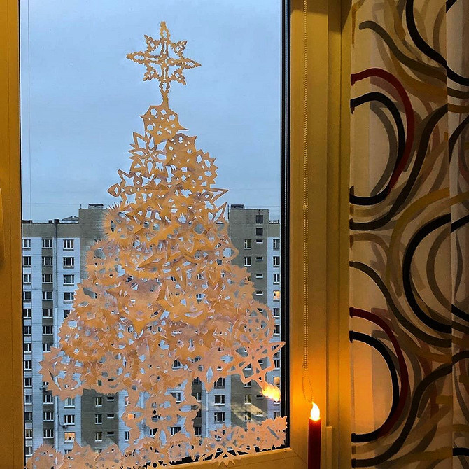 Новогоднее оформление окон на 2026 может быть очень разным. Самое простое решение — приклеить бумажные снежинки на окно и дополнить их тематическими узорами, также вырезанными из белой бумаги.