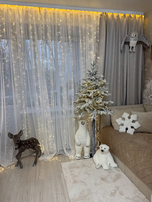 Завершающим штрихом к любой новогодней композиции станет гирлянда-штора: ее мерцающие в темноте огоньки в разы усилят праздничное настроение.