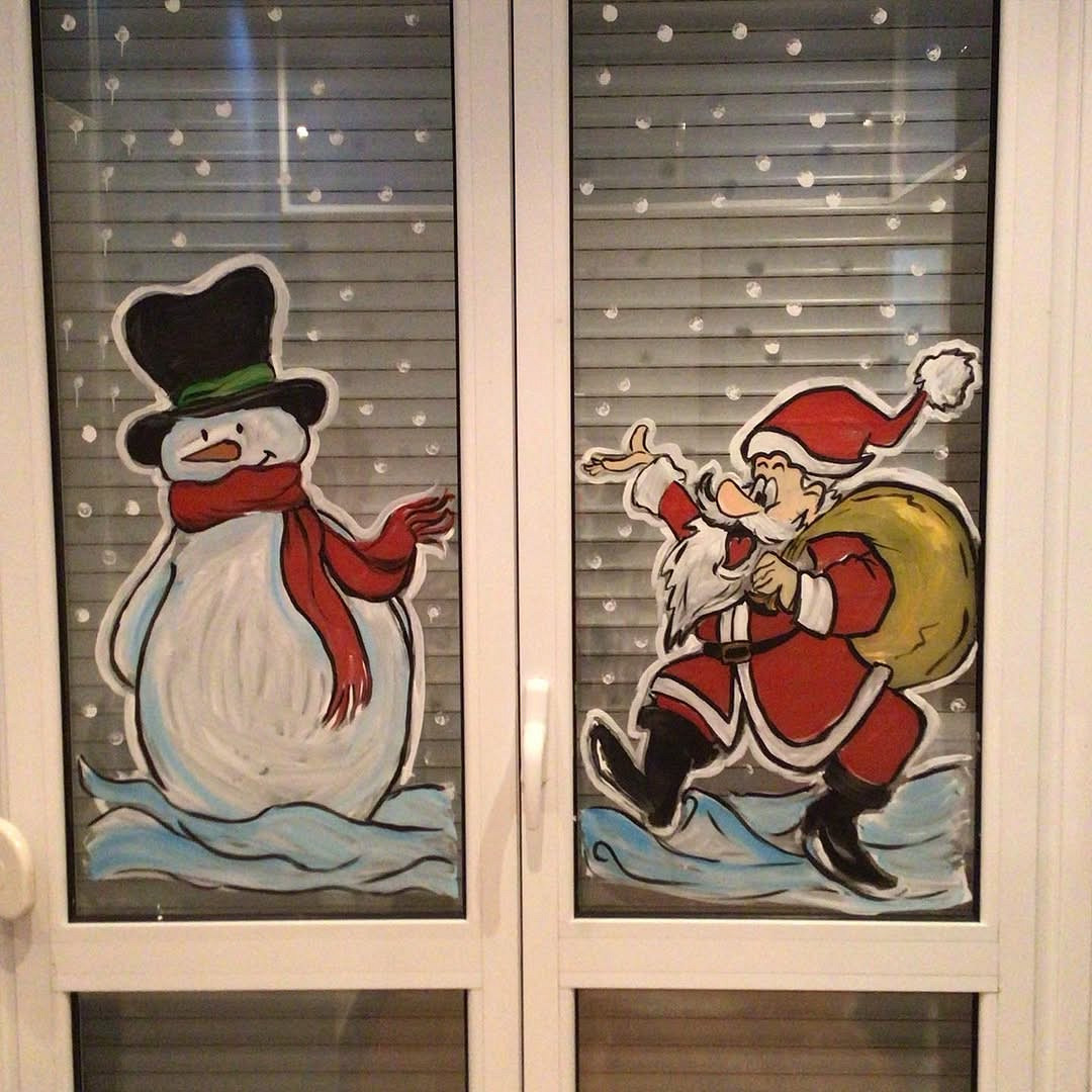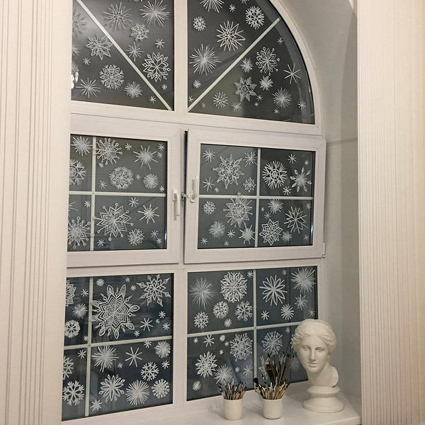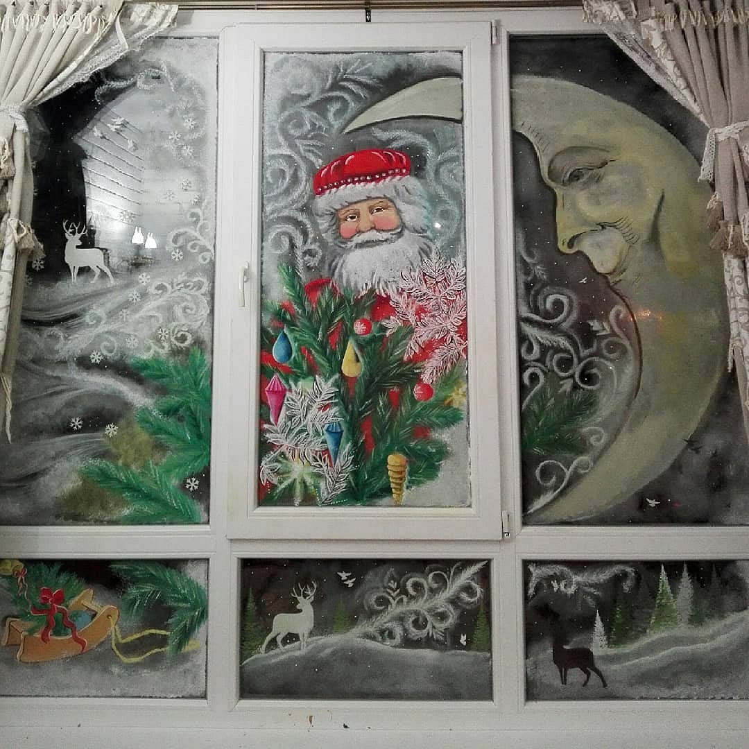 Из года в год остается популярным традиционный новогодний антураж. На окне может оказаться все, что вызывает ассоциации с зимними праздниками: снеговики, Дед Мороз и Снегурочка, заснеженная деревня, снежинки, колокольчики, звезды и т.д.