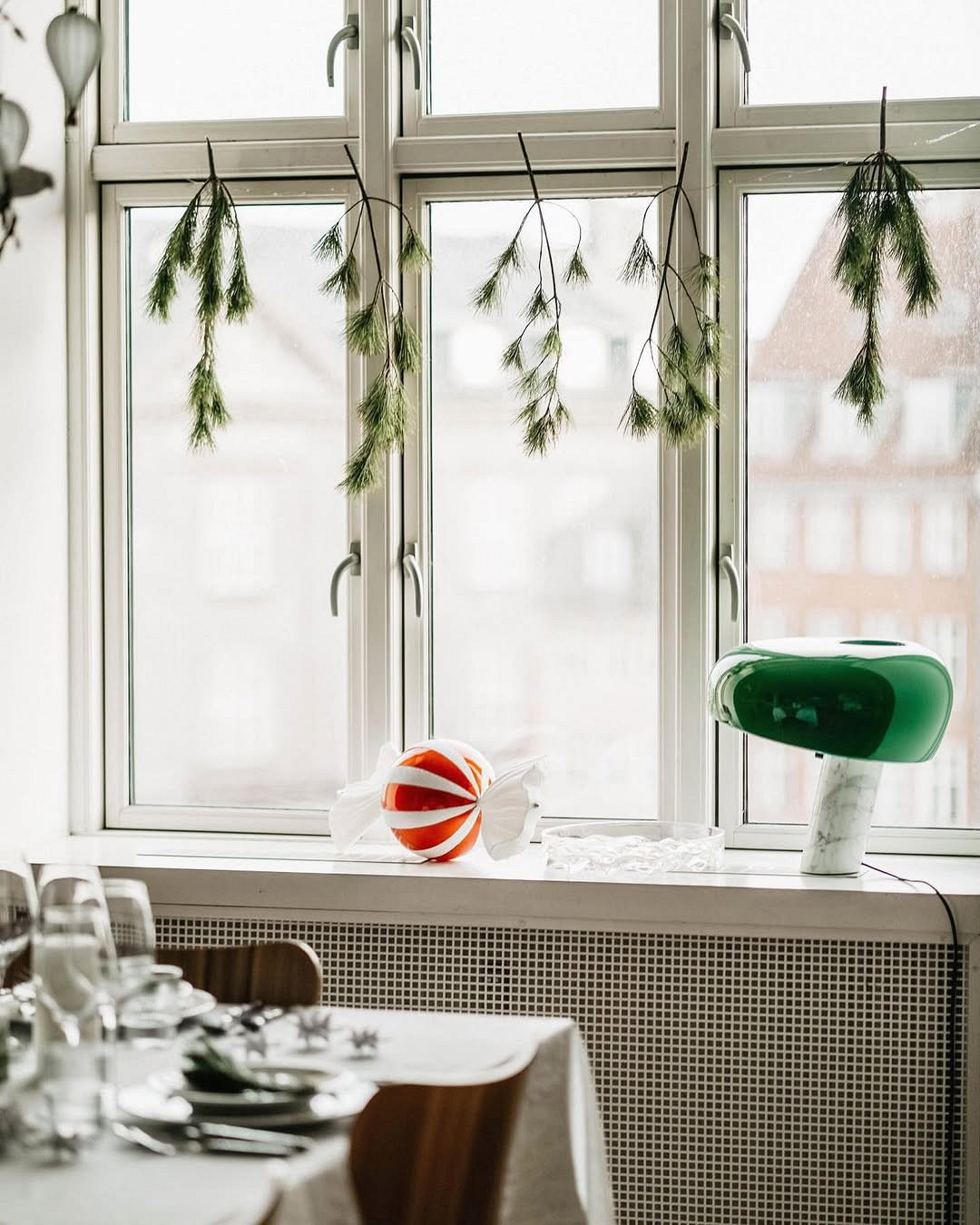 Минималистичное оформление организовать проще всего. Достаточно одной лаконичной гирлянды, натянутой между откосами, или скромной искусственной елочки на подоконнике. Никаких масштабных картин на стеклах, никакой мишуры или висящих гроздьями игрушек — праздничный интерьер должен быть умеренным: следует ограничиться буквально одним-двумя украшениями. Для декора можно использовать однотонные гирлянды, скандинавские звезды, небольшие подсвечники или светодиодные свечи простой формы, несколько еловых веточек или сдержанный еловый венок.