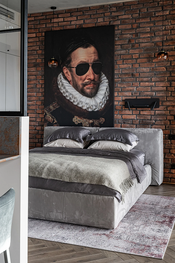 При выборе ковра в гостиную или спальню можно отталкиваться от крупной мебели. Зачастую именно она становится фокус-точкой в интерьере, а отделка выступает фоном. Например, в этом стильном лофте для холостяка отправной точкой стала кровать. Причем подобрали не только близкий оттенок, но и матовую бархатистую фактуру, как у основания и изголовья. Получилась гармоничная цельная композиция.