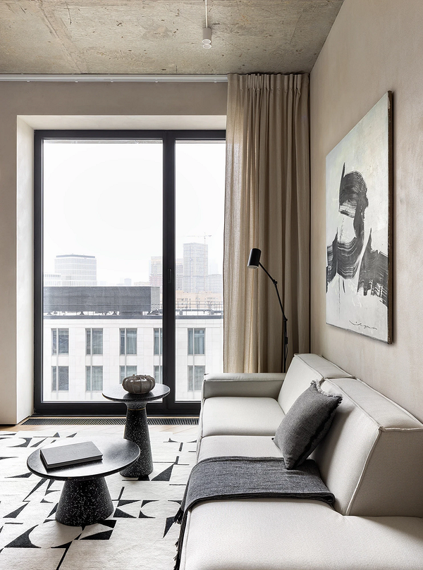 В нейтральном интерьере текстиль и декор часто выступают в роли акцентов. Ковер тоже может стать самой яркой деталью в комнате: например, как в этой квартире для девушки. Кухня-гостиная выполнена в мягком бежевом монохроме, который дизайнер оживила с помощью более ярких деталей. Самой крупной из них стал мягкий ковер с абстрактным узором. Один из его цветов повторяет плед на диване, благодаря чему нет ощущения инородности.