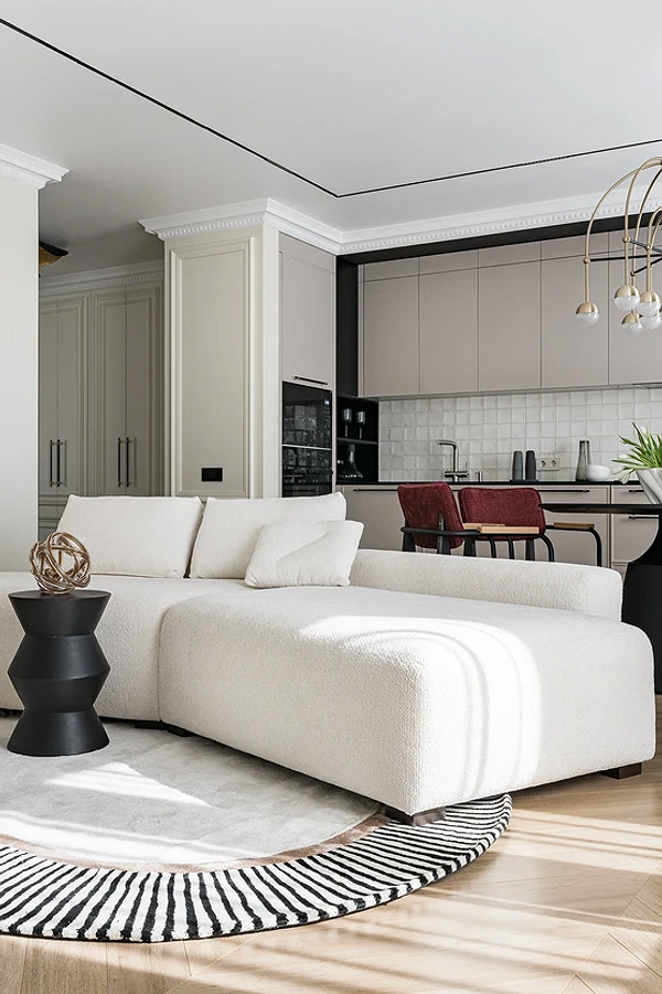 Еще один способ сделать ковер акцентом в комнате — подобрать не яркий цвет, а необычную форму. Сейчас в тренде сложные силуэты, новые интерпретации привычных геометрических фактур, многослойность. Это может быть и правильный круг или овал, как в этой кухне-гостиной, но с интересными деталями. В данном случае это контрастная окантовка, которая преображает обычный белый ковер.