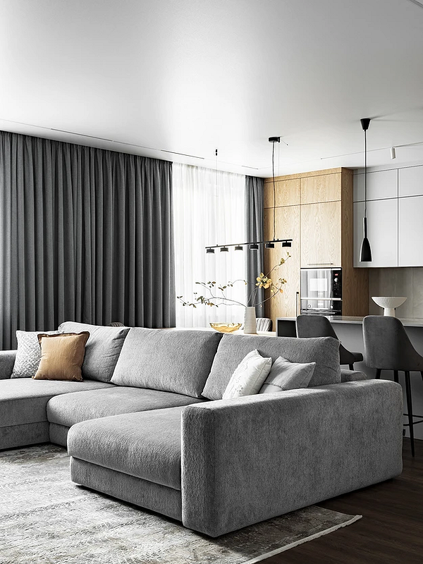 Не обязательно подбирать ковер строго по цветам или форме. Можно уложить на пол модель классической формы в нейтральной гамме, тем самым зонировав пространство. Это отличный вариант для студии или просторной кухни-гостиной, как здесь. Ковер в данном случае визуально обозначает зону отдыха и поддерживает монохромную серую палитру.