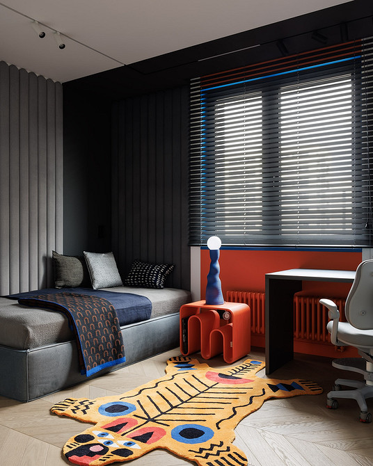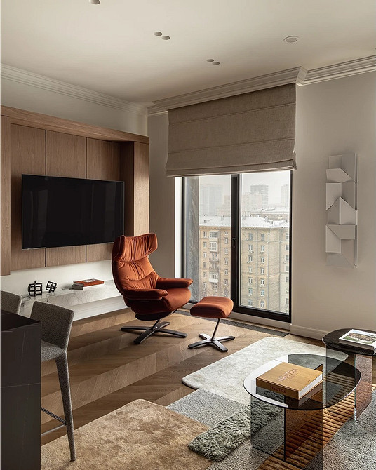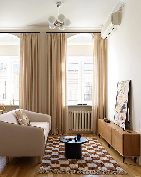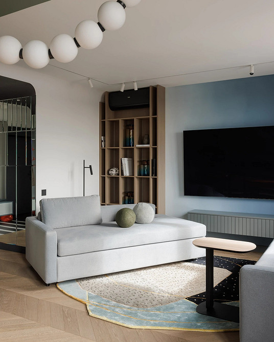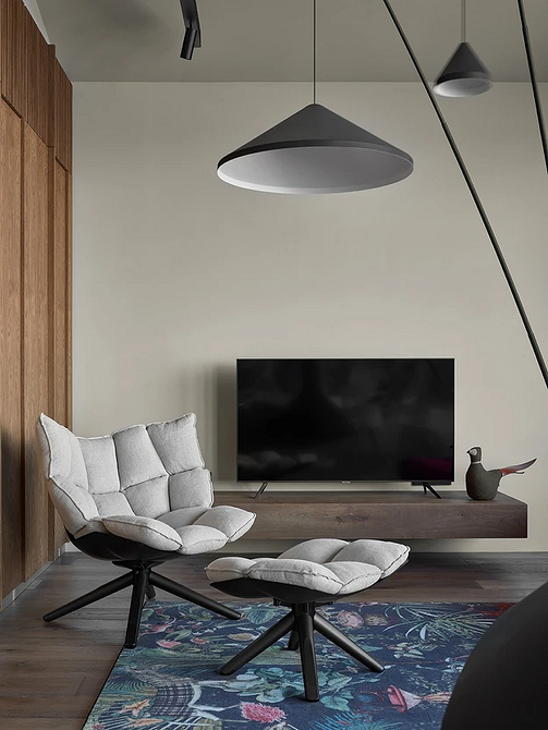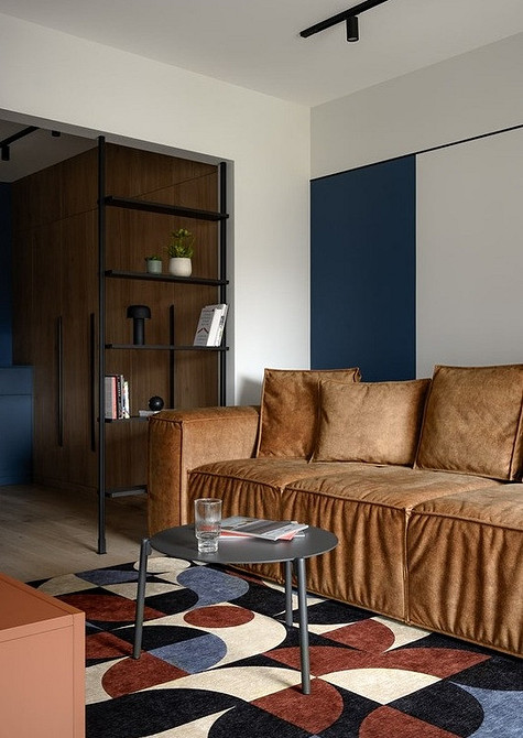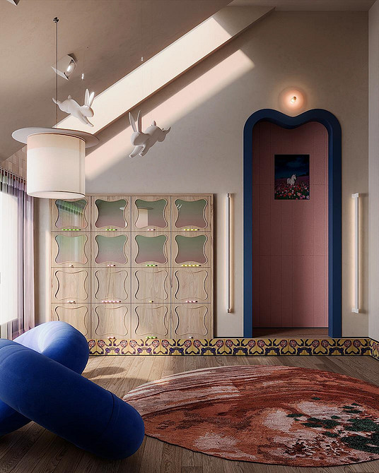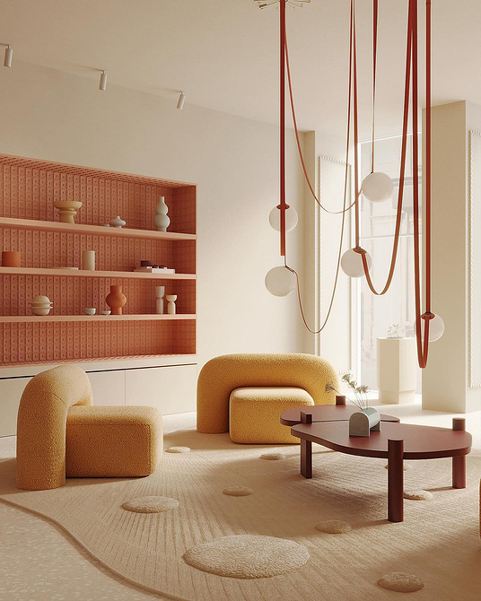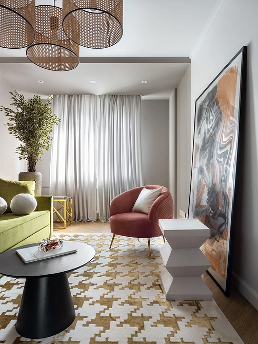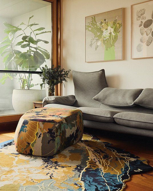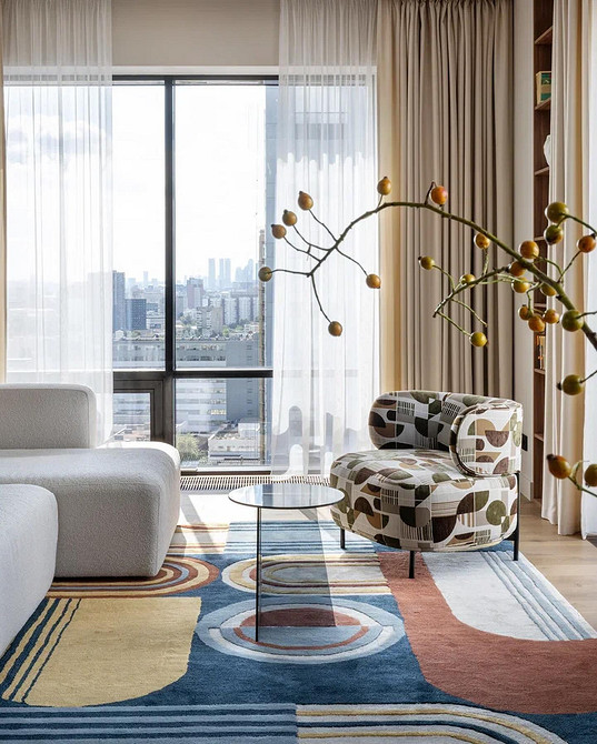 Присмотритесь к моделям с асимметричной композицией и рисунком, напоминающим калейдоскоп или 3D-графику. Особенно интересно решение смотрится в минималистичных пространствах — там ковер становится главным визуальным акцентом. А чтобы сохранить баланс, используйте нестандартную геометрию в спокойной цветовой гамме: серо-бежевых, молочных или песочных тонах.