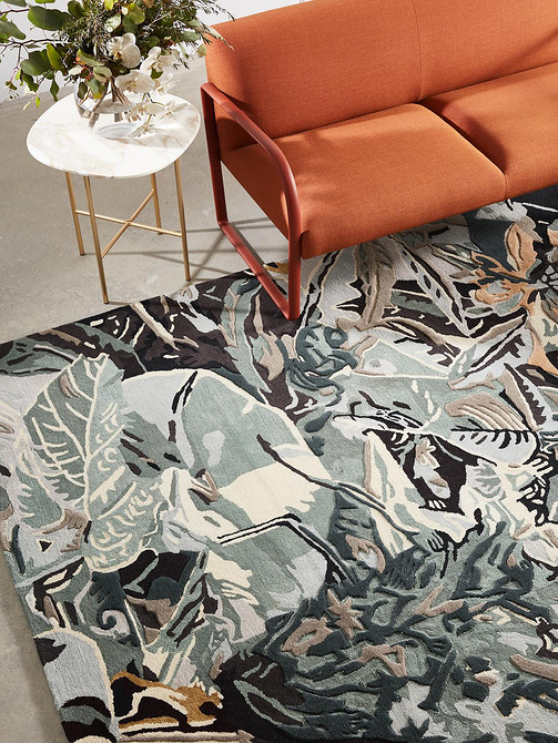 Палитра вдохновлена окружающими пейзажами. В приоритете приглушенные зеленые, коричневые, песочные тона. Также тему поддерживают анималистичные узоры. Лучше всего комбинировать ковры с деревянной мебелью и текстилем из натуральных тканей.