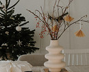 - Составить минималистичную композицию. Оставьте новогодний декор из веток как есть или дополните такой букет парой лаконичных игрушек: например, вырежьте фигурки из плотной бумаги.
