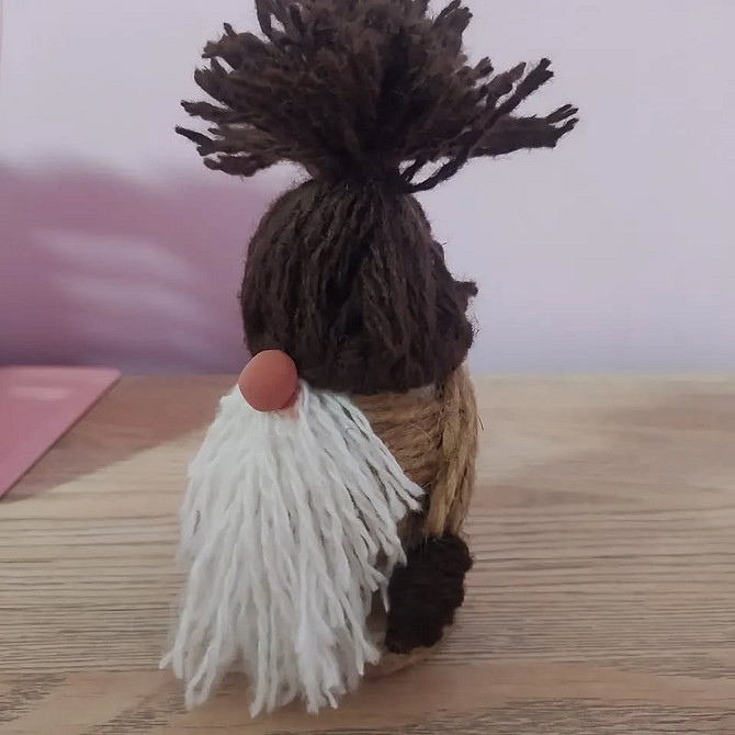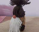 - Из картонной втулки: обмотайте втулку грубой веревкой, из темной пряжи сделайте помпон-колпак, из белой — бороду. Приклейте нос-бусину.