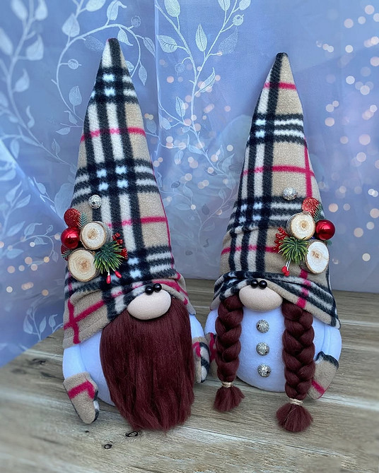 - Флис и фетр. Имеют достаточно плотную, но мягкую текстуру, поэтому они хорошо держат объем и при этом не выглядят жесткими и угловатыми. Кроме того, они не осыпаются при обрезке, а значит, не требуют обработки краев. Вдобавок к этому у них приятная ворсистая фактура, и игрушки из них получаются уютными и приятными на ощупь, что соответствует атмосфере зимних праздников. Обычно из этих тканей делают туловище гнома.