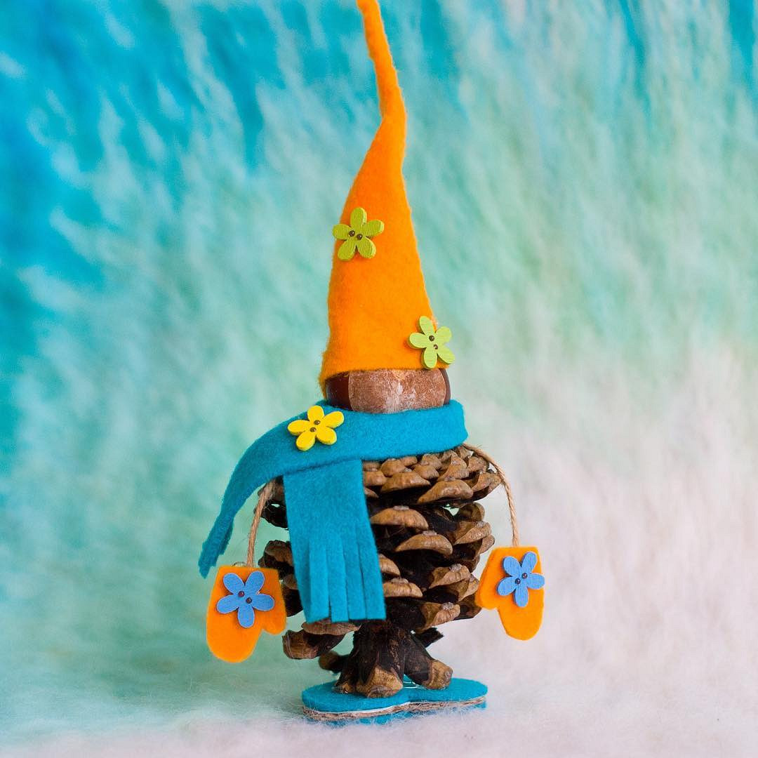 - Из шишек: приклейте к шишке каштан-голову и бороду из пряжи, наденьте колпак — и игрушка готова.