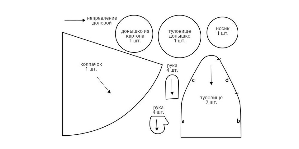 - Сшейте детали для рук и варежки, пришейте их друг к другу, а затем к туловищу (к наклонным частям — с и d).