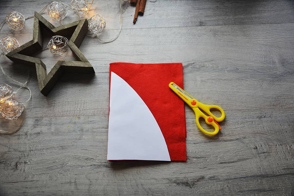 - Из куска текстиля вырежьте треугольник и склейте его края термоклеем, чтобы получился колпак.