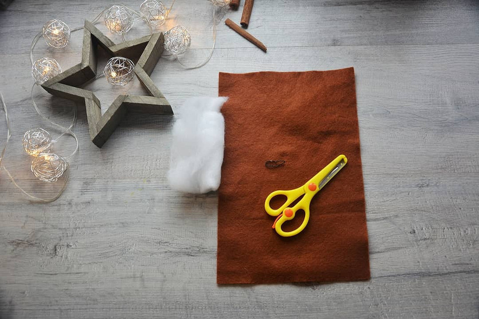 - Подготовьте все необходимые материалы и инструменты: ткань, мех или шерсть для бороды, большую деревянную бусину для носа, наполнитель, картон, ножницы, нитку с иголкой, портновский мелок и распечатанный и вырезанный шаблон.