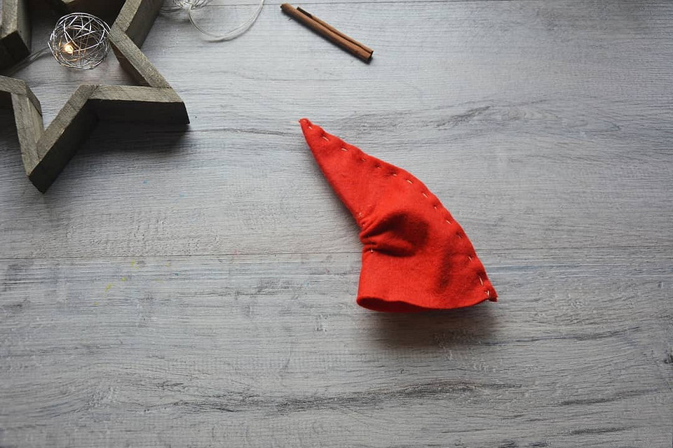 - Сшейте по боковым швам колпак, наденьте его на гнома так, чтобы он доходил до носа и бороды, и пришейте.