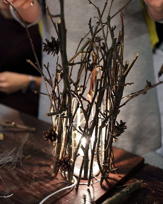 Из более мелких веточек также можно сделать много полезных вещей, например, украсить ими светильник.