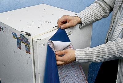 Таким же образом оклейте всю поверхность холодильника (боковые и верхнюю части), постепенно отделяя бумажную основу.