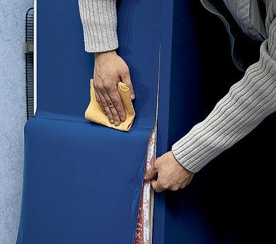 Приклейте пленку на дверцу с небольшим припуском по вертикали, разглаживая ее мягкой тряпкой.