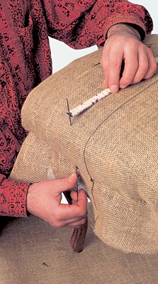 Свяжите пружины бечевками таким образом, чтобы в задней части сиденья они были ниже, чем в передней. Затем дополнительно закрепите их промежуточным шнуром и закройте плотной тканью, пришив ее к каждой пружине и прибив гвоздями к клиньям и перекладинам сиденья.