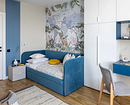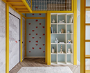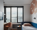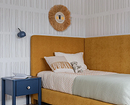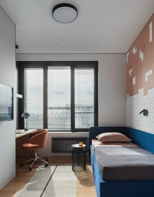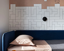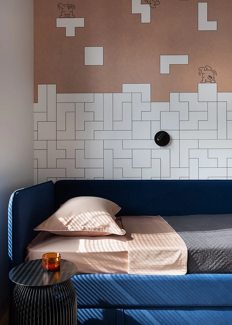 Эта квартира принадлежит семье с двумя детьми, каждому из которых досталась собственная комната. Обе декорировали обоями. Так в одной из комнат появились необычные покрытия с отсылками к ретроиграм. Несмотря на то, что цвета обоев сами по себе не слишком яркие, получилось контрастное и динамичное сочетание — то что надо для мальчика.