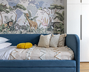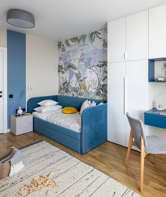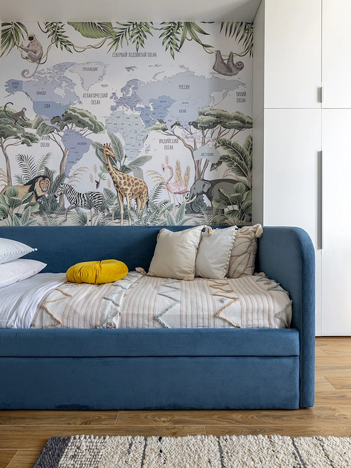 Обои в детской могут совмещать декоративную и обучающую функцию. Так, в этой комнате дизайнер оформила стену за кроватью панно с картой мира и изображением флоры и фауны. Природные цвета смотрятся спокойно и в то же время живо, а мальчик может постепенно изучать мир самостоятельно или при участии родителей. Оттенки обоев частично дублируются в мебели и декоре, благодаря чему акцентная отделка органично вписывается в обстановку.