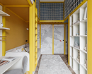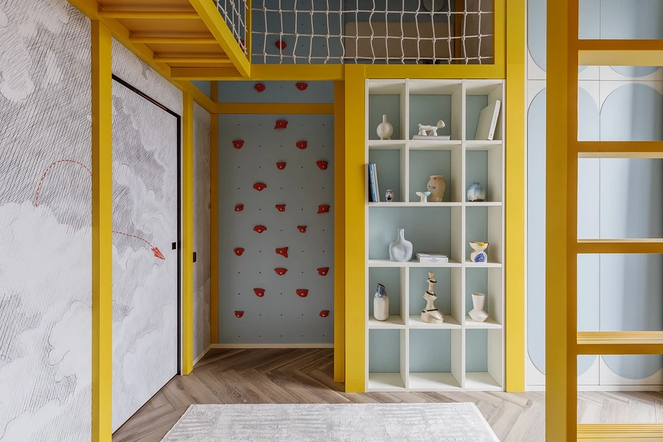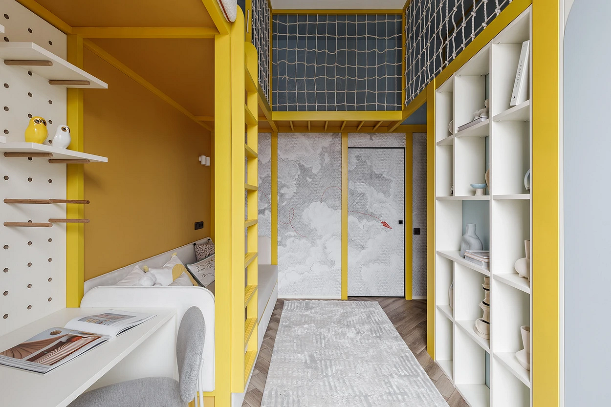 Эта жизнерадостная детская — хороший пример баланса отделки и яркой мебели. Основой палитры стало контрастное сочетание белого и желтого, которое дополняет серо-голубой. Пестрые обои при таком количестве активного цвета смотрелись бы избыточно, поэтому дизайнер подобрала покрытие со сдержанным рисунком облаков, напоминающим карандашный набросок. Маленькая, но цепляющая деталь — красный бумажный самолетик с прорисованной траекторией полета, который перекликается с элементами спортивного уголка.