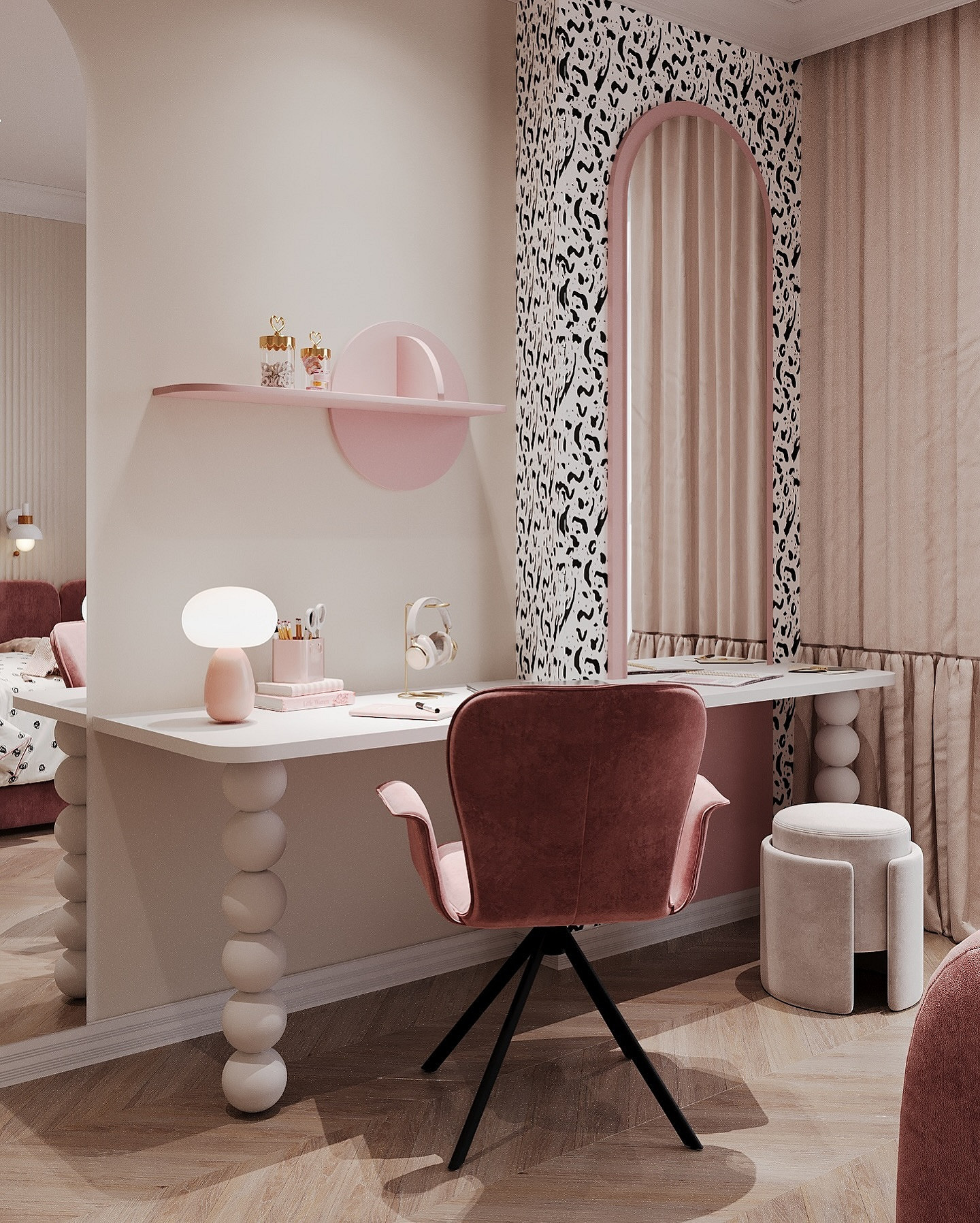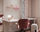 В проекте на фото дизайнер оформила детскую для девочки. Обои здесь играют роль точечного акцента, дополняя краску. Ими выделили зону за зеркалом, подобрав полотна с мелким абстрактным рисунком. Сочетание черного и белого смотрится ярко, но не аляповато, и эффектно контрастирует с мягкими кремовыми и розовыми оттенками. Благодаря этому детская выглядит нежной, но не «сахарной».