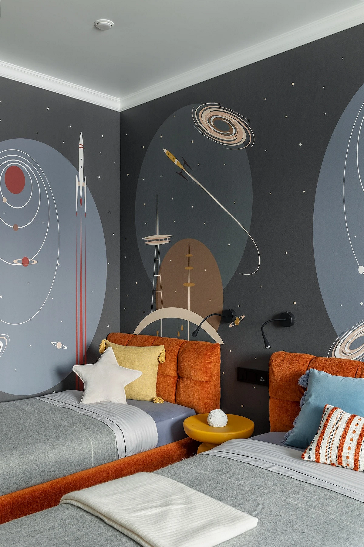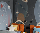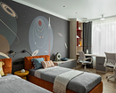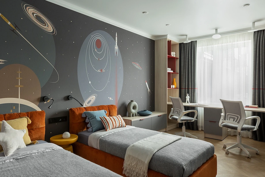Многие опасаются темных обоев — и очень зря. Во многих случаях они уместны: например, если полотна с тематикой космоса, как здесь. Комнату двух братьев школьного возраста оформили тематически, вдохновением послужила концепция космического корабля. Так стенах появились звезды, планеты и межгалактический транспорт, а яркие и светлые детали уравновешивают темно-серые.