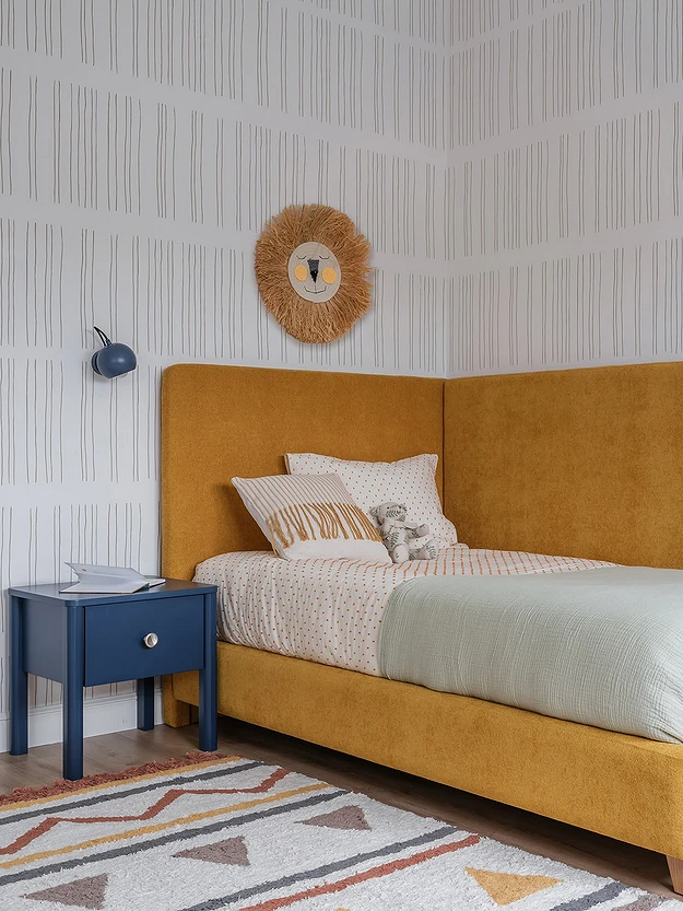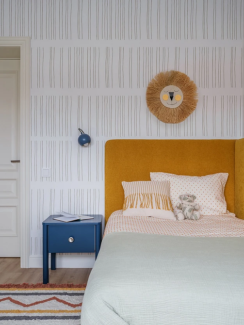 Эту детскую в загородном доме оформили для маленькой девочки на вырост. В интерьере важно было сбалансировать яркие краски и нейтральную основу, чтобы не перегружать пространство и остаться в рамках общей стилистической концепции. Главным цветовым пятном стала мебель, а стены оклеили сдержанными светлыми обоями. Но с изюминкой — рисунок на них напоминает нарисованные от руки линии. Это классическая геометрия, но в необычном, оттого эффектном прочтении.