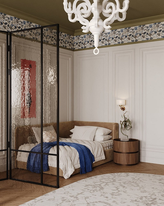 Обои давно используют не только как фоновую отделку для всех четырех стен. Но и не обязательно клеить их вертикально, от пола до потолка. Посмотрите, как реализовали акцентные покрытия в проекте на фото: пустили широкой горизонтальной полосой по периметру комнаты, обыграв края контрастным потолочным плинтусом и молдингами. Большая часть стен окрашена в нейтральный белый. А цвета орнамента повторяются в текстиле и лепном декоре, связывая контрастные оттенки воедино.