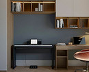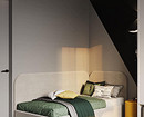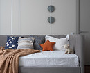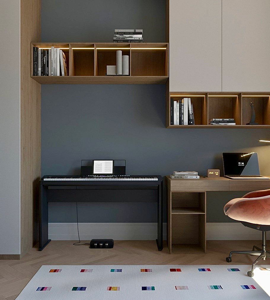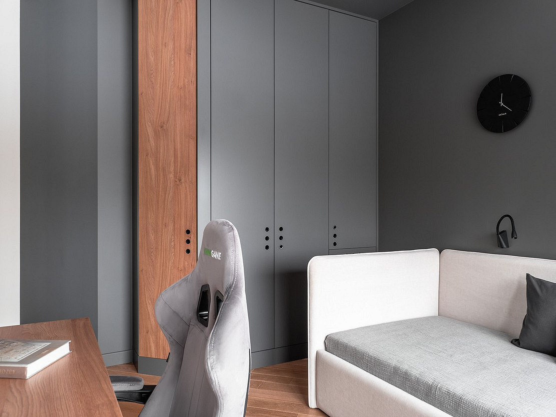 Такой дизайн смотрится современно и дорого, но в то же время не так претенциозно, как белый, и не так мрачно, как черный. Поскольку мебель занимает лишь часть комнаты, серости получается не настолько много, как при полной отделке в этой палитре, а значит, влияние цвета будет умеренным — он будет успокаивать и дарить ощущение стабильности, но не слишком расслаблять при этом.