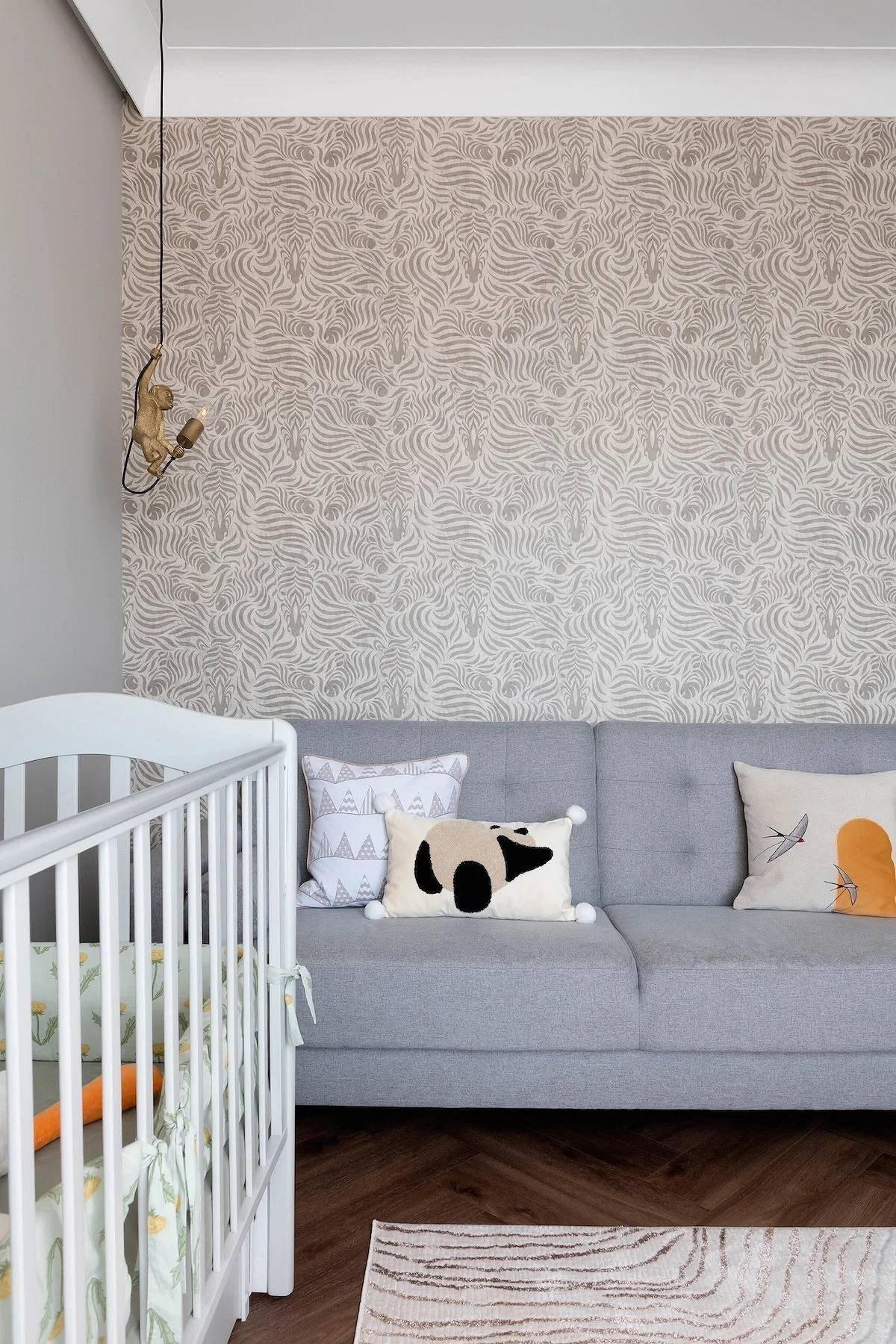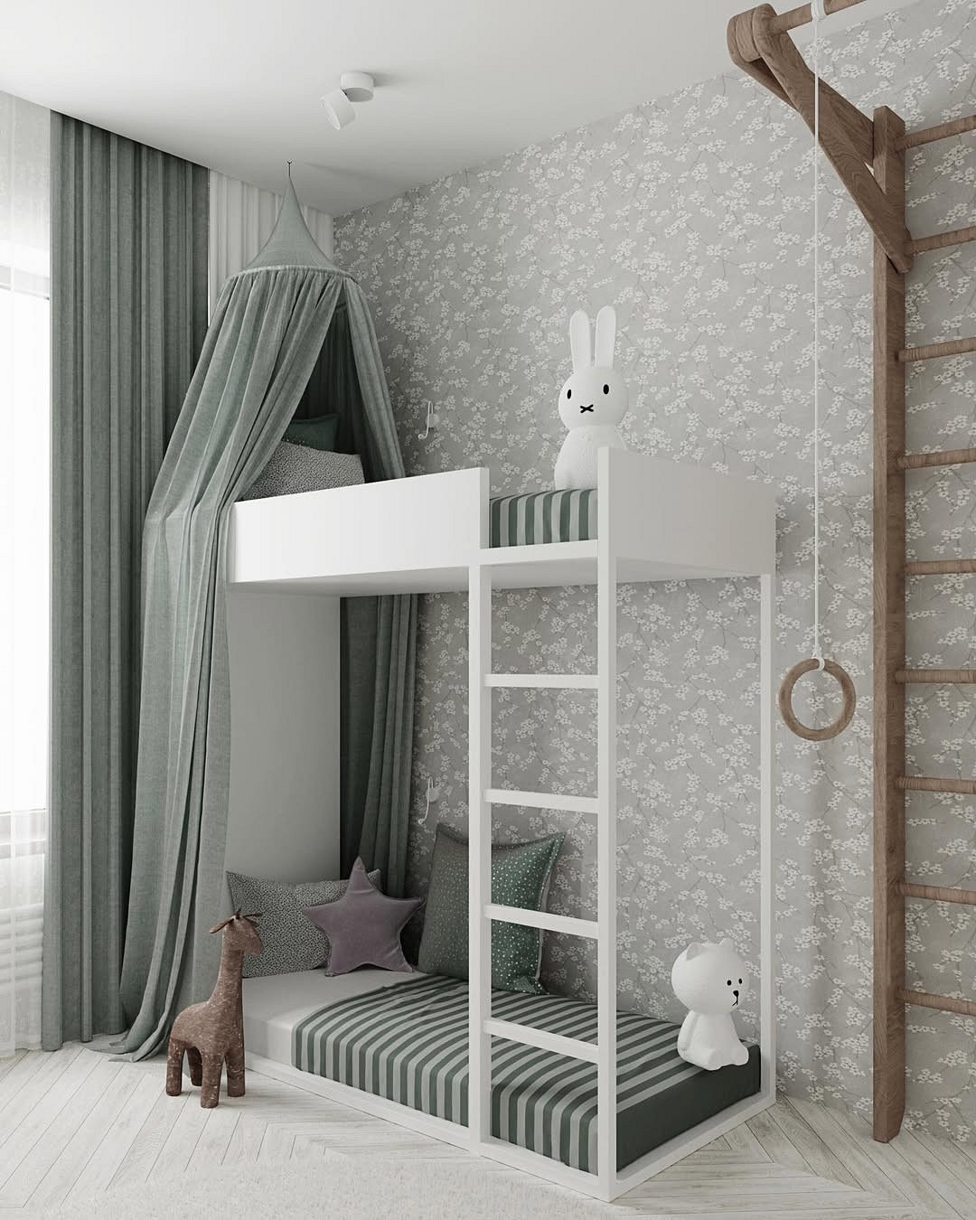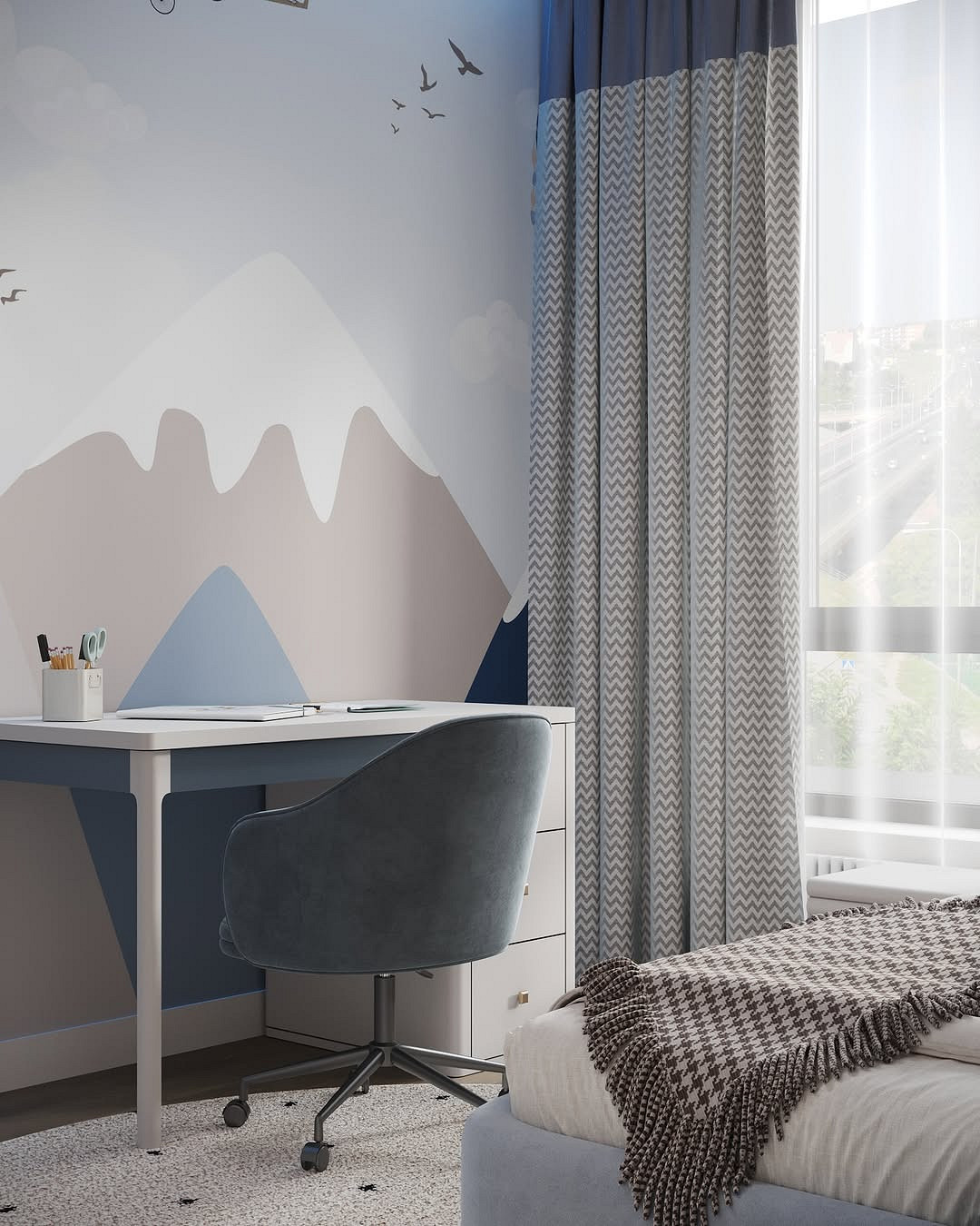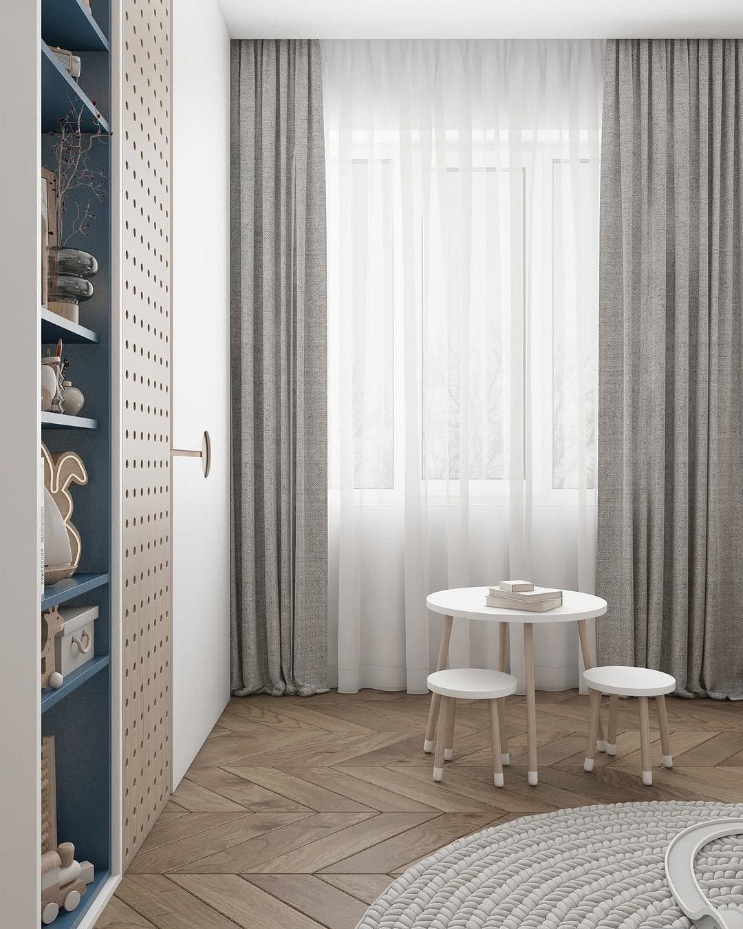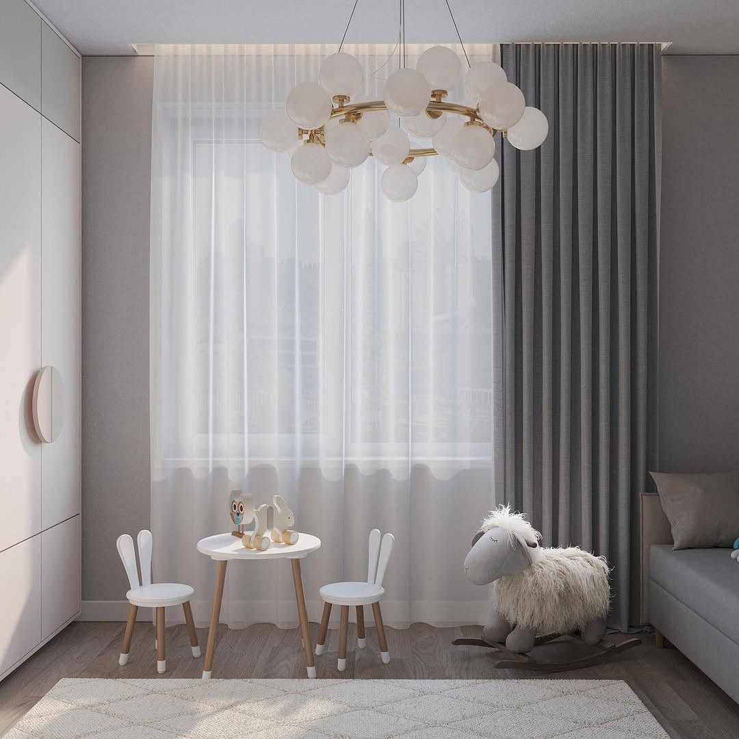 Правильно подобранный, этот цвет действует умиротворяюще и расслабляюще: в таких стенах приятно отдыхать и легко засыпать. Кроме того, он несет чувство защищенности и безопасности, что часто очень важно для маленьких детей. Также дымчатая палитра не отвлекает внимание и за счет этого помогает ребенку сосредоточиться на игре или учебе.