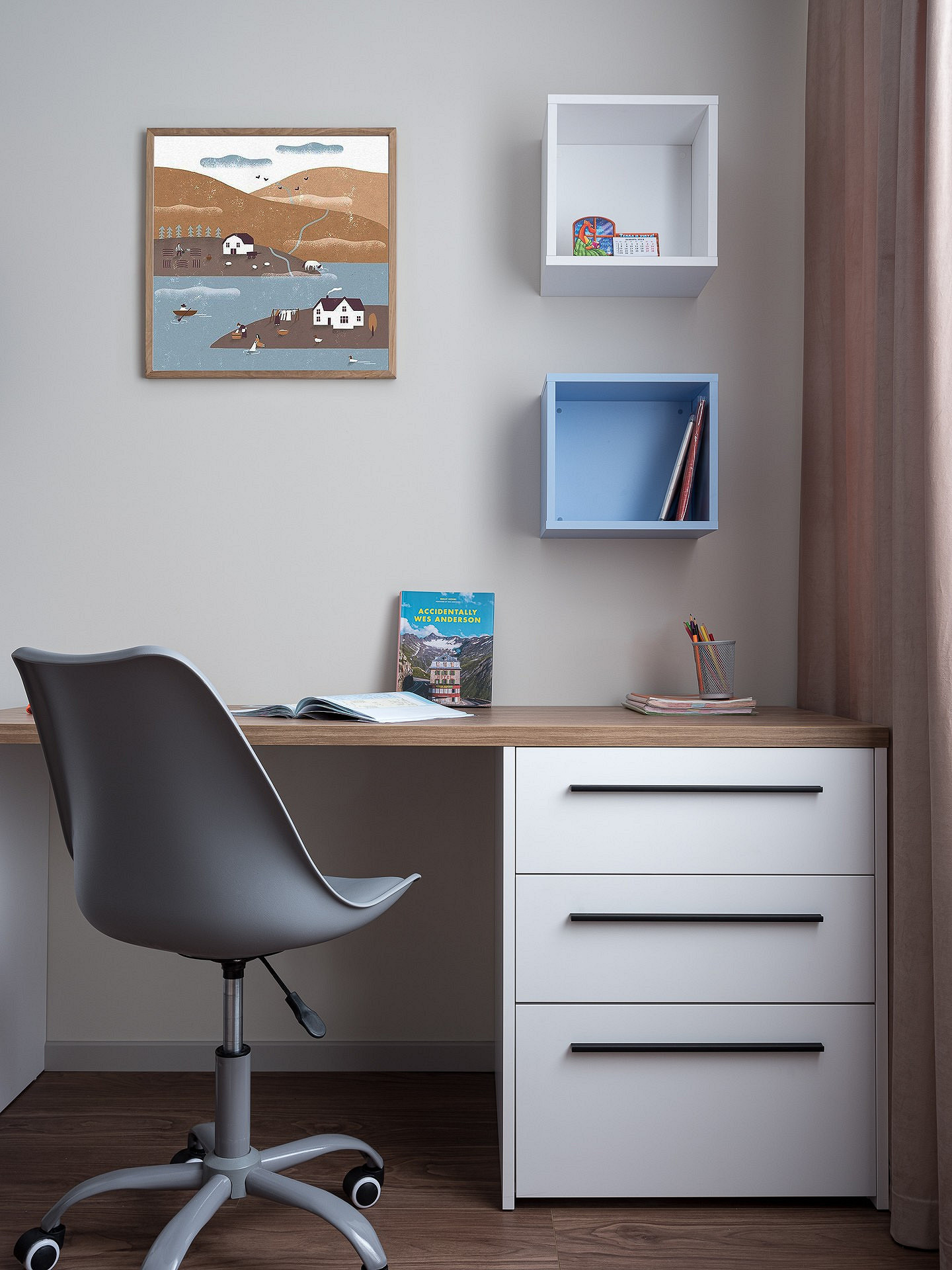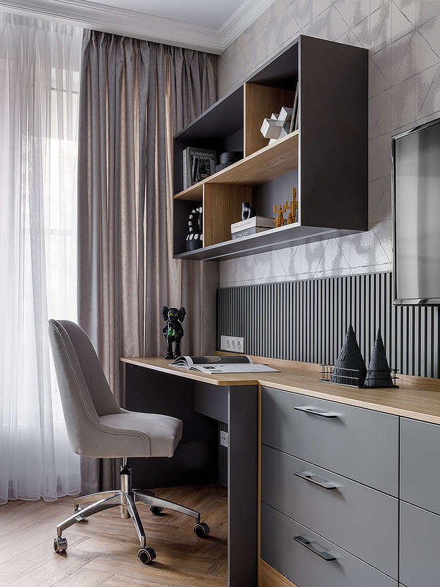 При этом не обязательно делать серым абсолютно все: достаточно добавить лишь несколько элементов, но сделать это везде. Например, можно выбрать обои и занавески, где он присутствует в рисунке, а к ним добавить однотонный ковер, диван и компьютерный стул в том же оттенке.