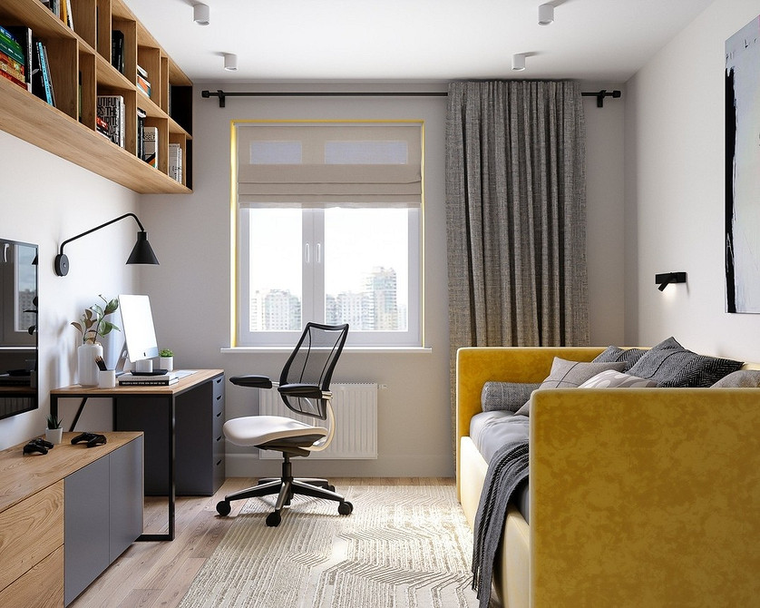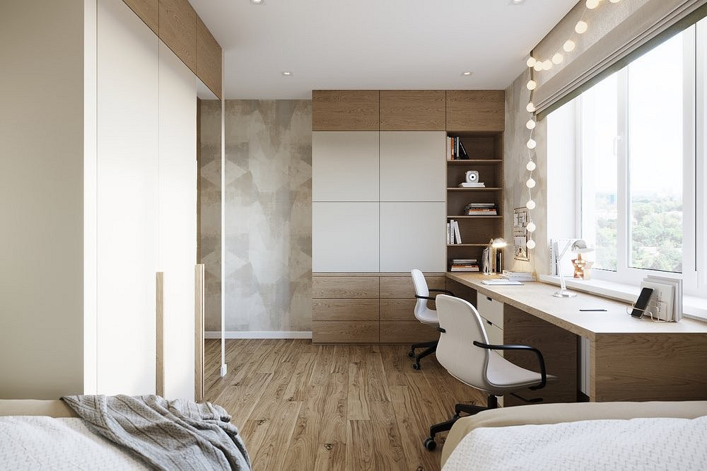- В средней и старшей школе на первое место выходит учеба, поэтому обстановка в комнате должна помогать сконцентрироваться, а не наоборот. Выбирайте спокойные приглушенные оттенки для оформления стен.