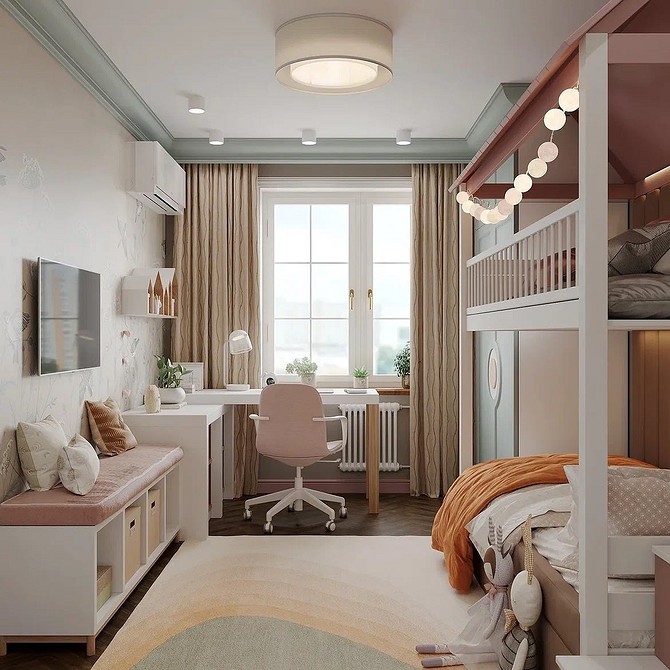 Если вы оформляете интерьер для брата и сестры, особенно с разницей в возрасте, лучший выход в такой ситуации — политика нейтральности. Чтобы не было споров из-за цвета и принта, оформите окна однотонным или двухцветным текстилем в гендерно-нейтральных оттенках. Пусть он будет достаточно спокойным, чтобы не привлекать лишнее внимание и лишь дополнять интерьер, оттеняя более яркие элементы.