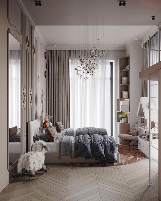 Лаконичные портьеры в пол — классика, которая уместно смотрится в любом помещении, в том числе в спальне ребенка.
