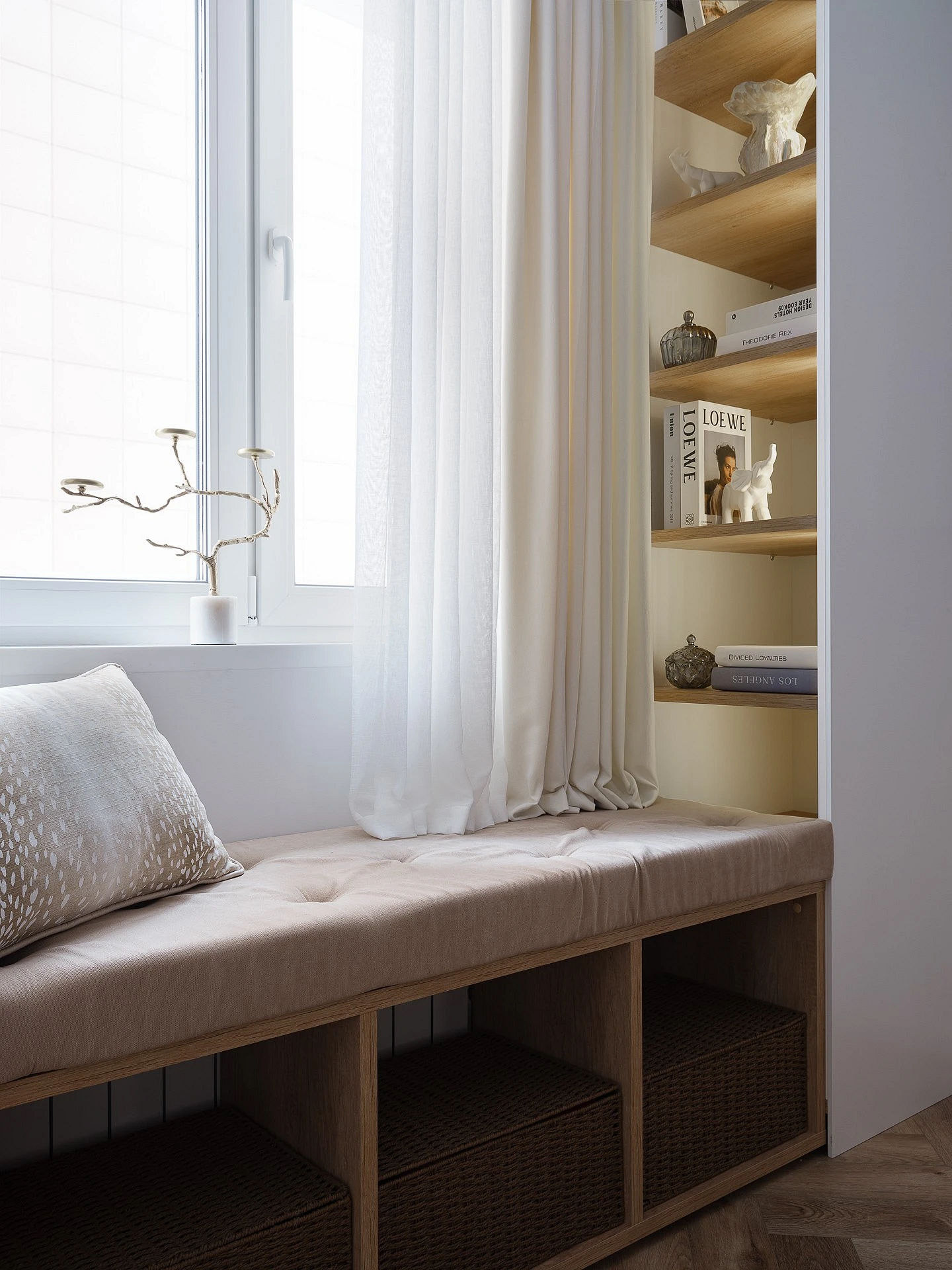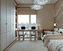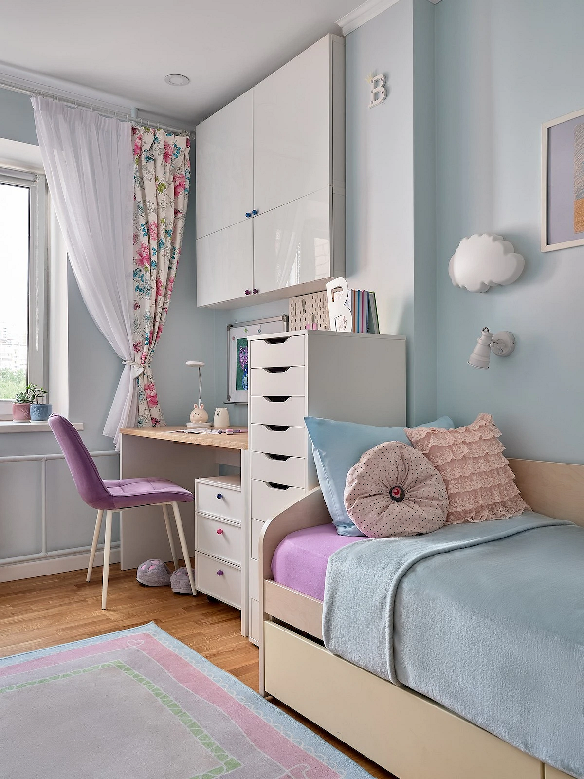 Если одна из девочек значительно младше, придется учитывать разные режимы дня. Нужно проявить изобретательность и зонировать комнату так, чтобы свет от рабочего стола старшей не мешал дневному сну младшей. Используйте плотные шторы, раздвижные перегородки или высокие стеллажи, чтобы разделить зоны и обеспечить детям приватность. Не забудьте выделить старшей девочке место для хранения «взрослых» вещей (косметики, учебников, декора), до которых малышка не сможет дотянуться.