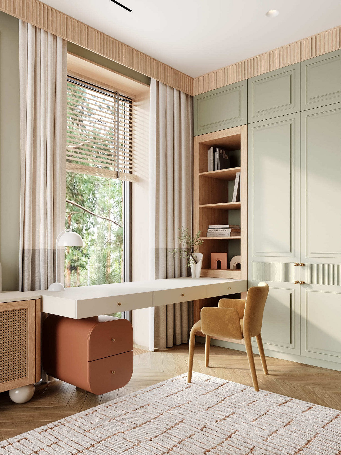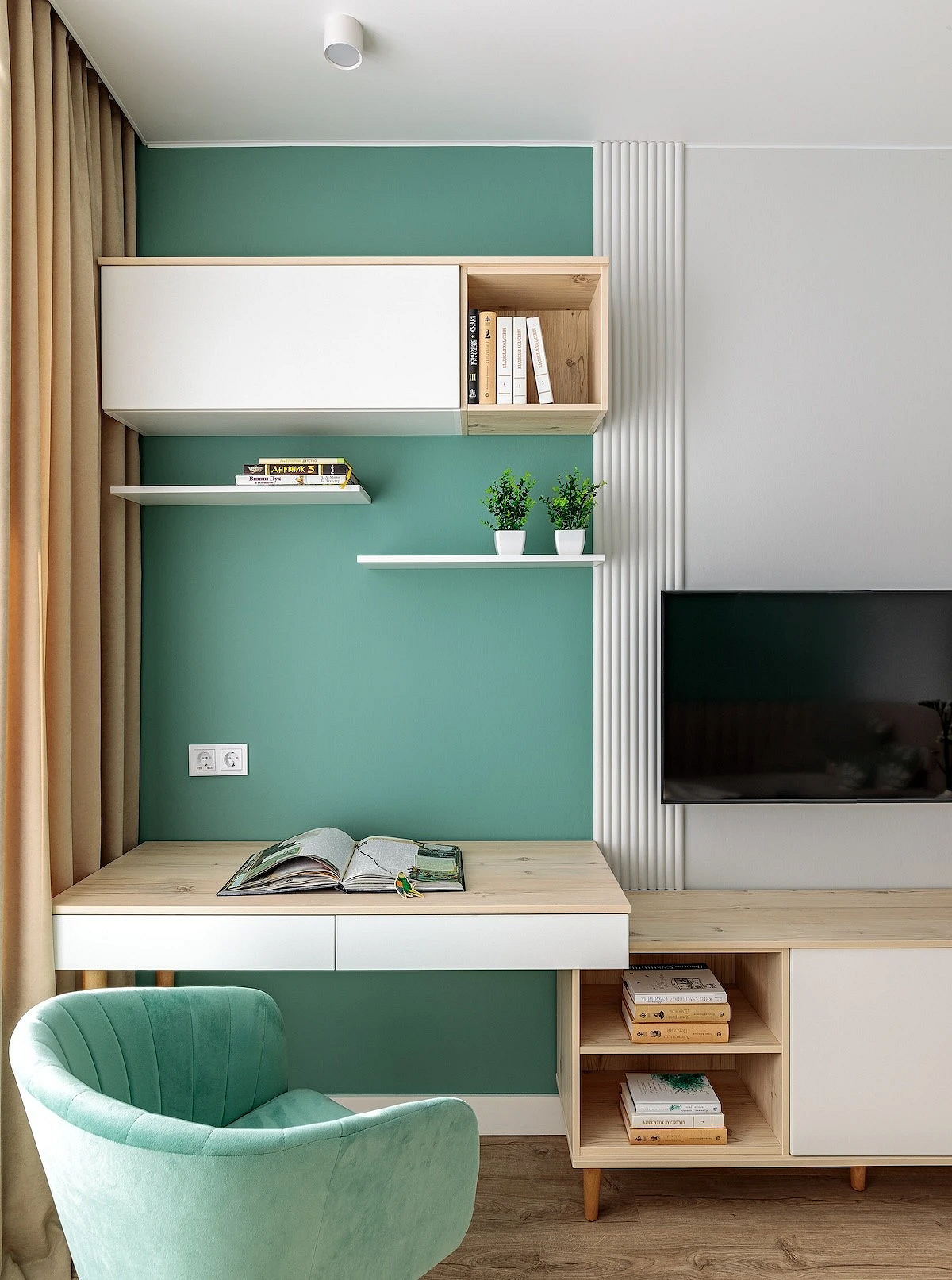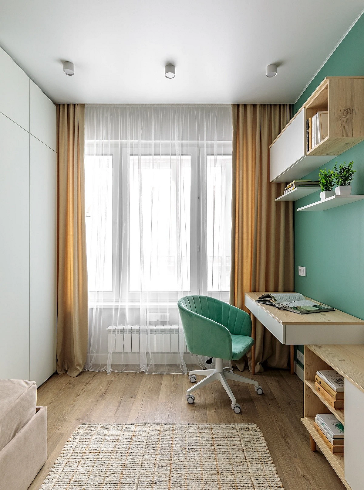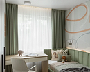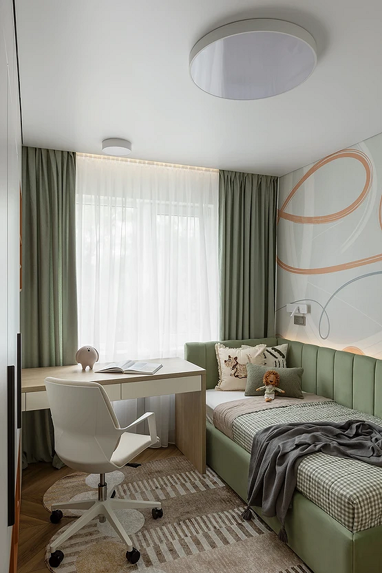 - Шалфейный и оливковый — успокаивающие природные оттенки, которые создают уют и помогают сконцентрироваться на учебе. На фото детские комнаты для девочки-подростка в такой светлой гамме смотрятся очень стильно и тепло.