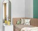- Зона сна — кровать желательно расположить в глубине комнаты или отгородить стеллажом либо перегородкой. Если места мало, рассмотрите кушетку с мягкой спинкой, которая днем служит диваном.
