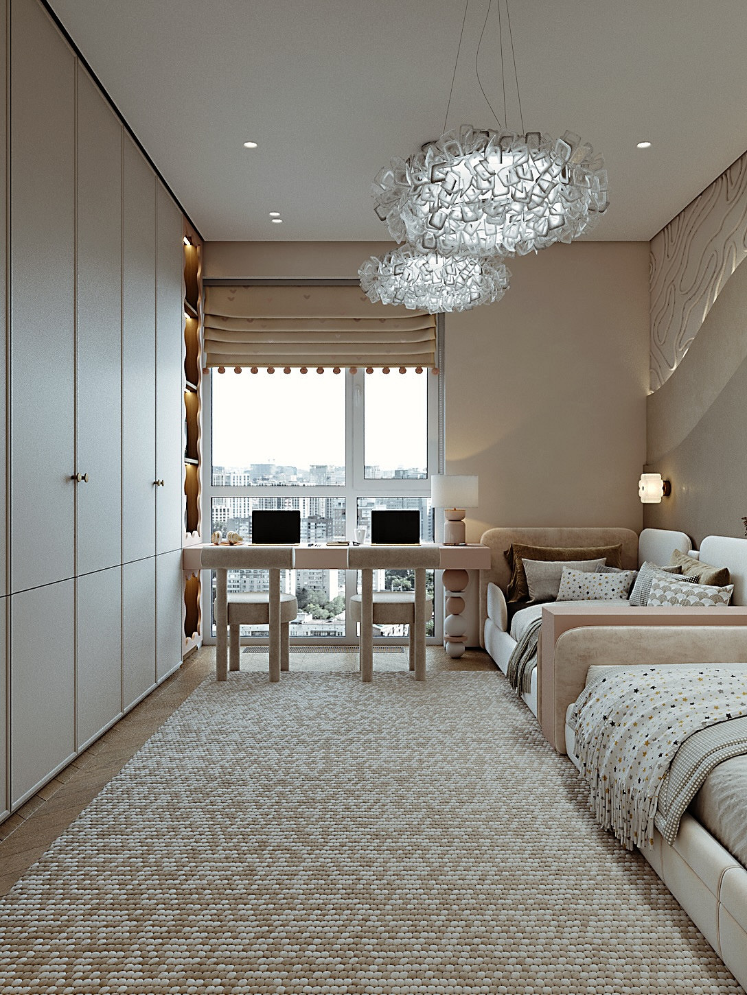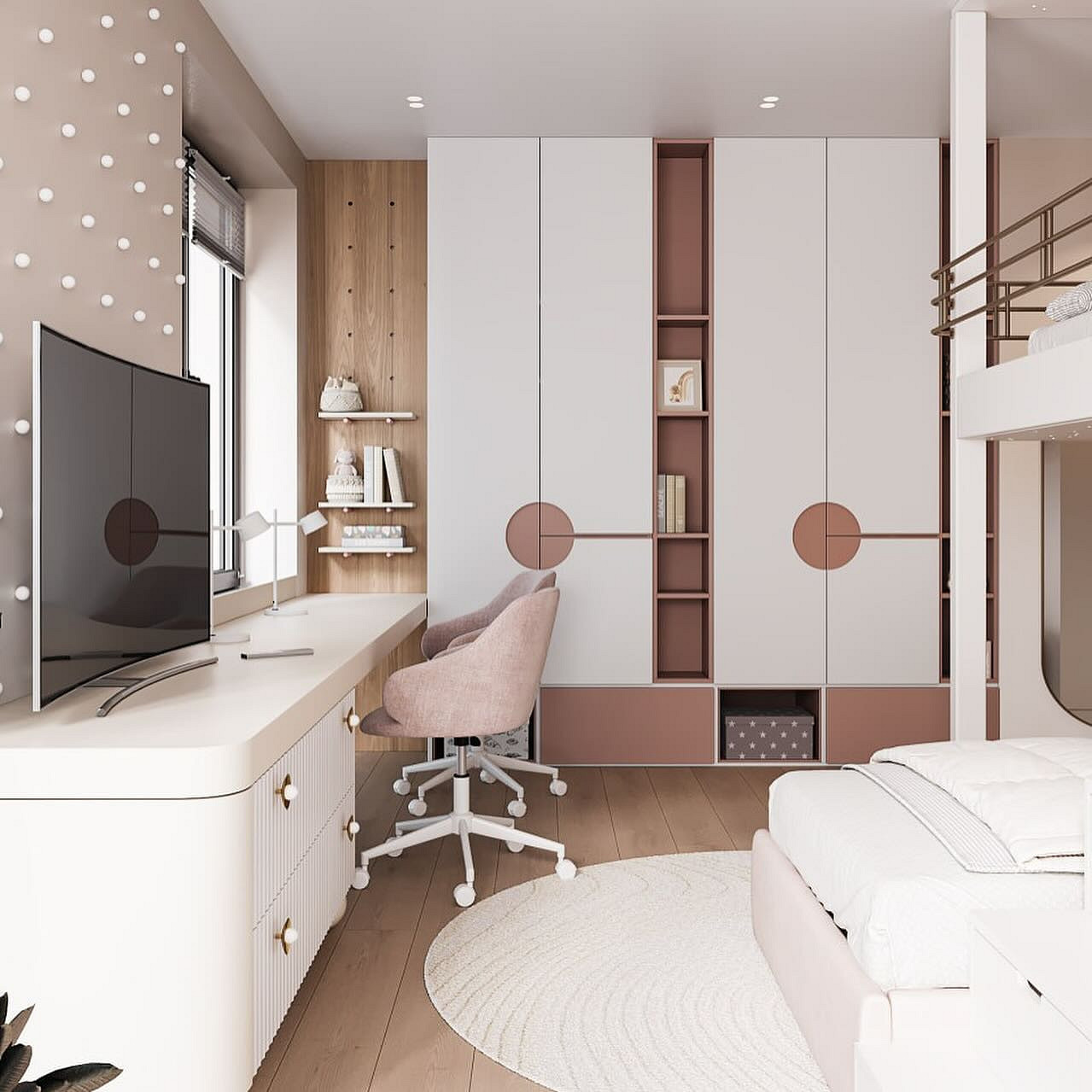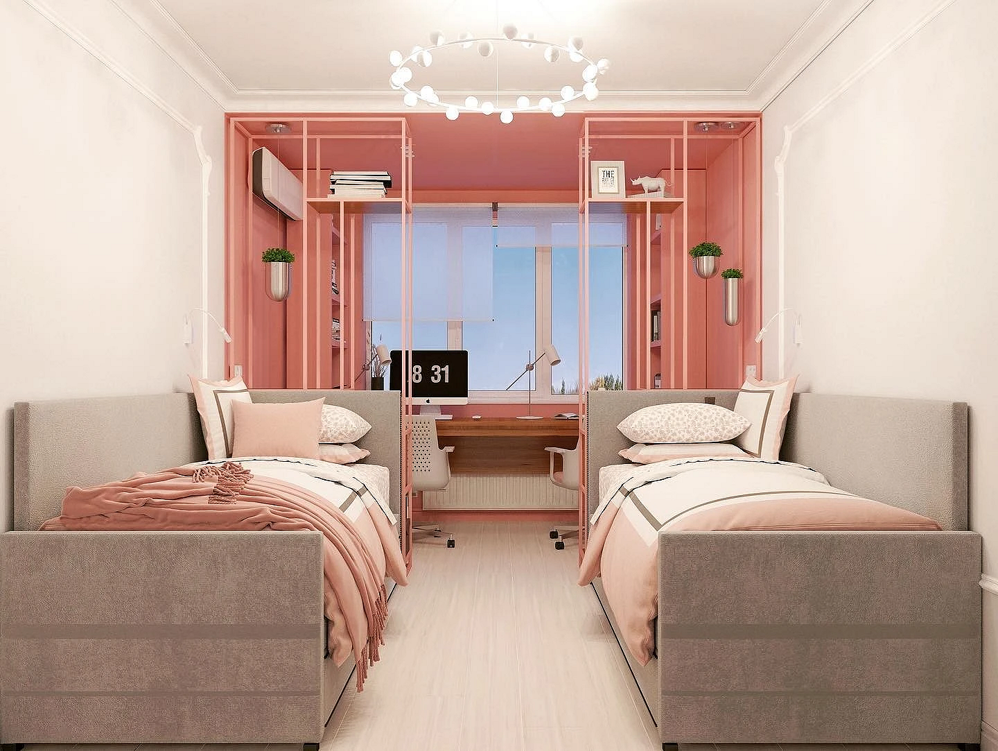 Можно поставить две одинаковые кровати вдоль одной стены или зеркально друг другу, разделив их общей тумбой или стеллажом. При такой планировке девочки находятся в равных условиях, что минимизирует конфликты. Рабочую зону в этом случае лучше сделать единой: длинная столешница вдоль окна позволит сестрам делать уроки вместе, в то же время не мешая друг другу.