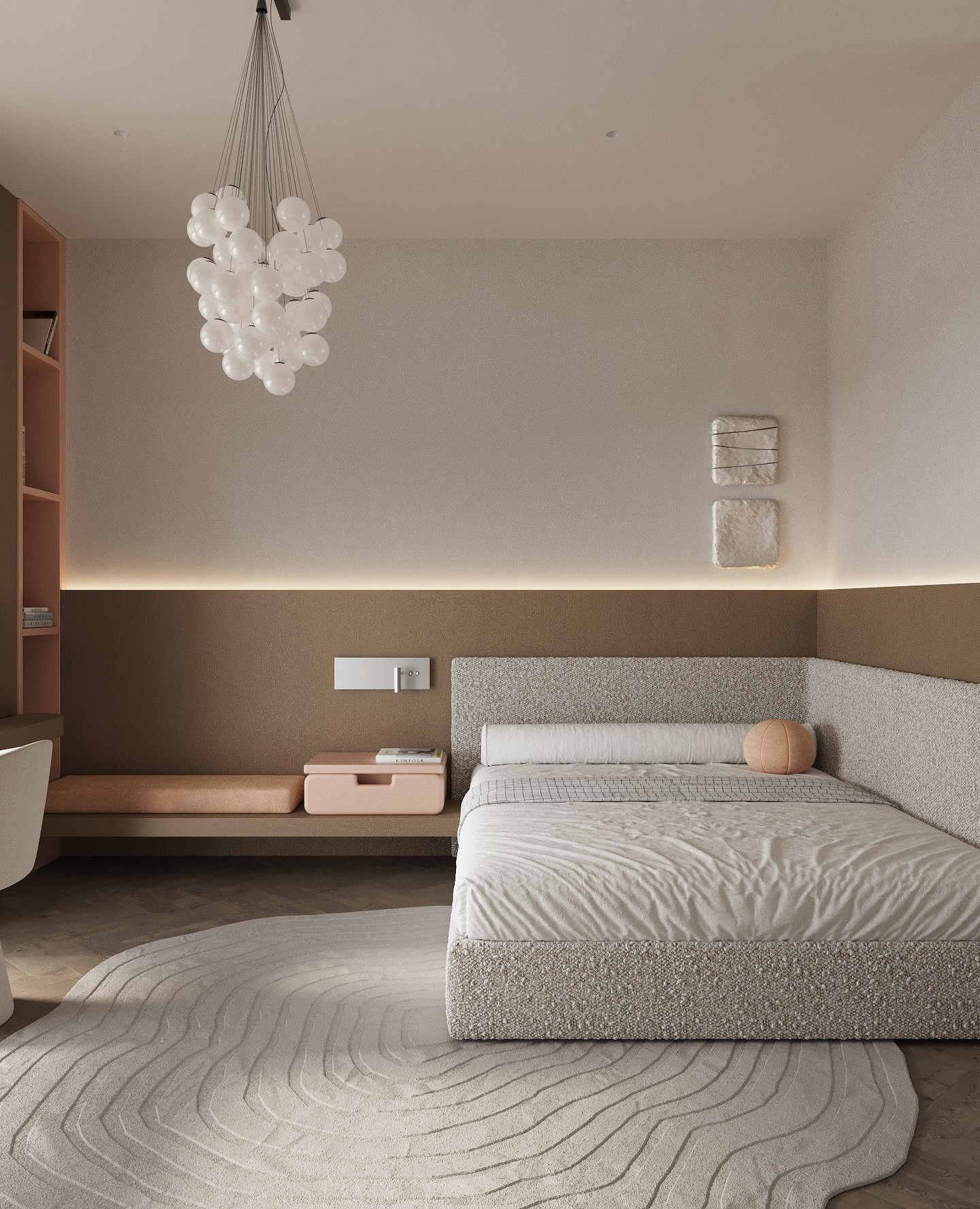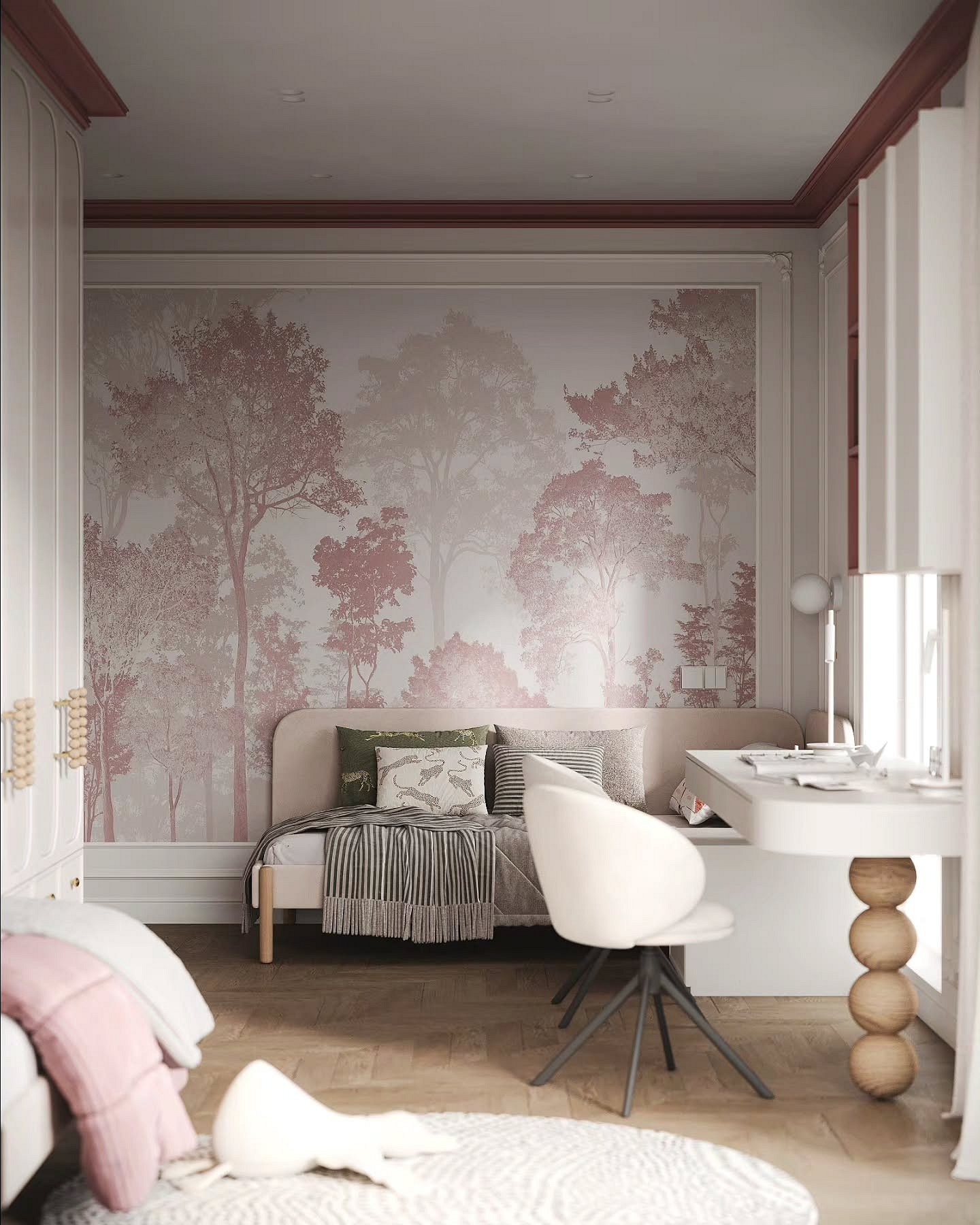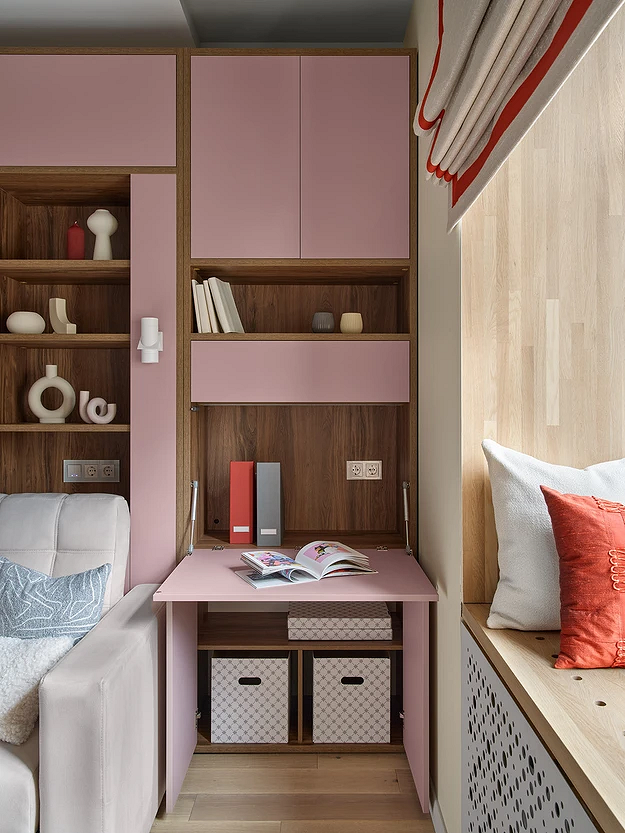 - Припыленный-розовый и терракотовый. Приглушенные теплые тона выглядят по-взрослому и особенно хорошо сочетаются с деревом.