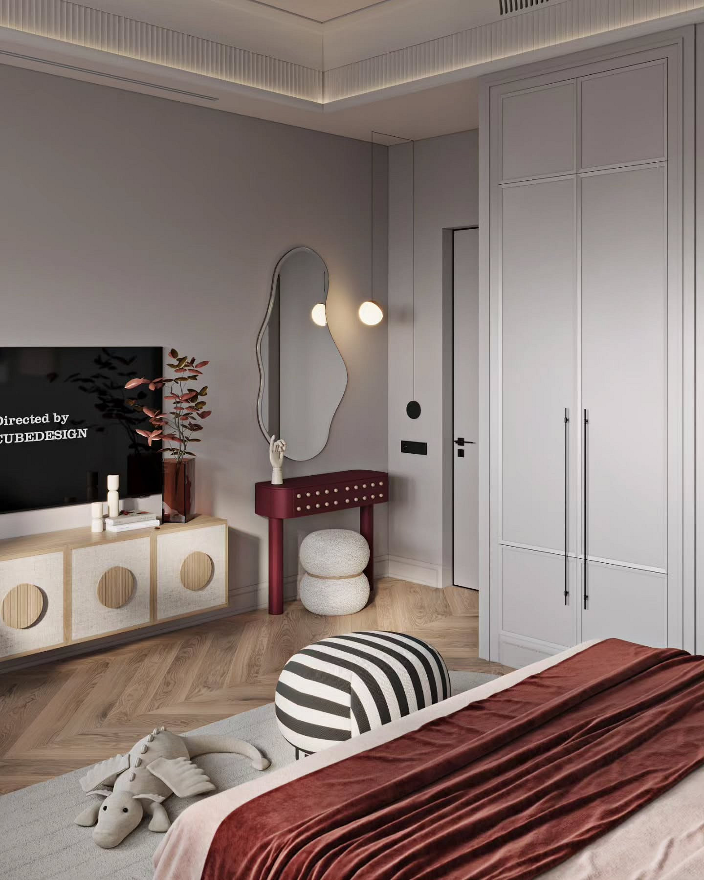 - Светло-серый — идеальный фон, который сочетается с любыми акцентами от землянично-розового до глубокого синего.