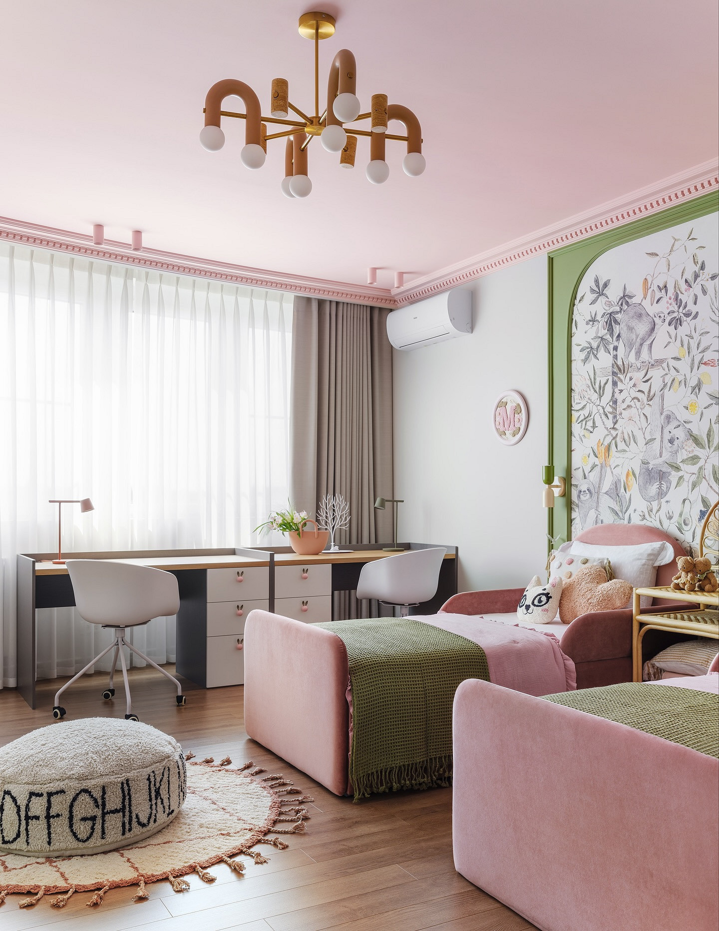 Если вы оформляете интерьер детской для девочек-подростков, которые близки по возрасту, делайте ставку на общие интересы и параллельное зонирование.