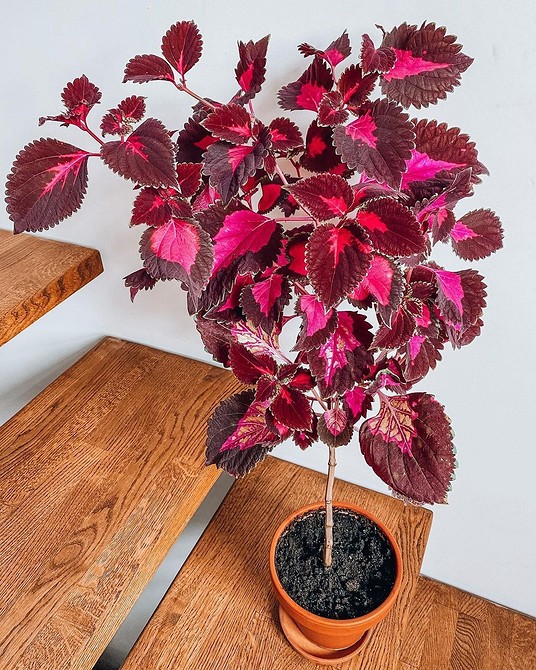Из-за формы листьев колеус называют комнатной крапивой. В зависимости от сорта листья могут быть фиолетовыми с розовыми, салатовыми, лимонными или малиновыми прожилками. Чтобы они имели яркую и контрастную окраску, поставьте растение в хорошо освещенную часть комнаты. С весны до осени его нужно поливать 2-3 раза в неделю, а зимой — 1-2 раза.