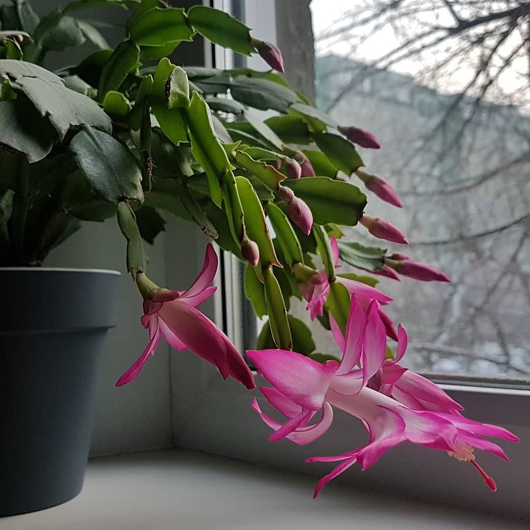 Иначе этот кактус называют декабристом или зимним цветком за то, что его цветение выпадает на декабрь и продолжается на протяжении зимы. Для обильного цветения этому растению нужно создать «зимние» условия: держать подальше от батареи при температуре около 18-20 °С. Пересаживать декабрист нужно примерно раз в 5 лет.
