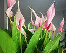 - Лили — один из самых красивых представителей этой группы. Покрывало в пастельных тонах, зауженное и слегка закрученное, удачно оттеняет более яркий початок, и все это дополняют листовые пластины свежего салатового оттенка. Еще одна особенность цветка — небольшая величина: он не вырастает больше 35-40 см.