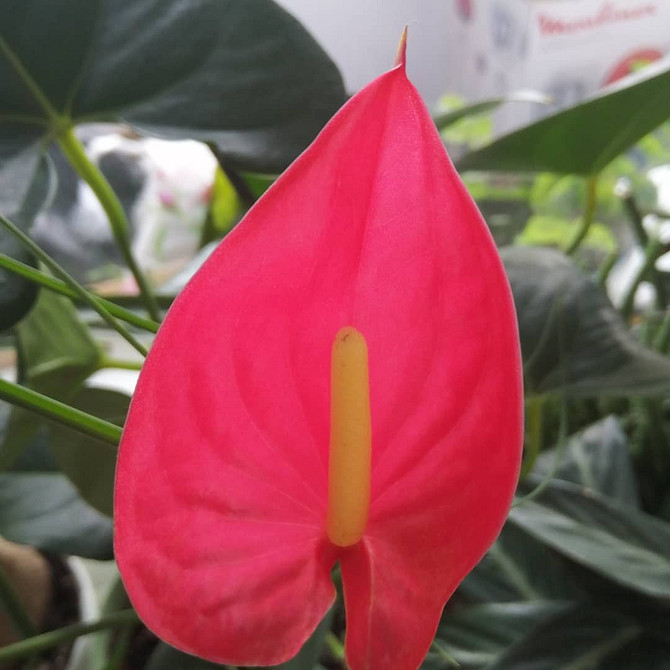 - Адиос Ред — у этого сорта антуриума цветки славятся не только изысканным красным оттенком, но и красивой, слегка отогнутой формой, а также сглаженными прожилками. Початок может быть желтым, однако иногда встречается и бордовая расцветка, что придает растению весьма экстравагантный вид.